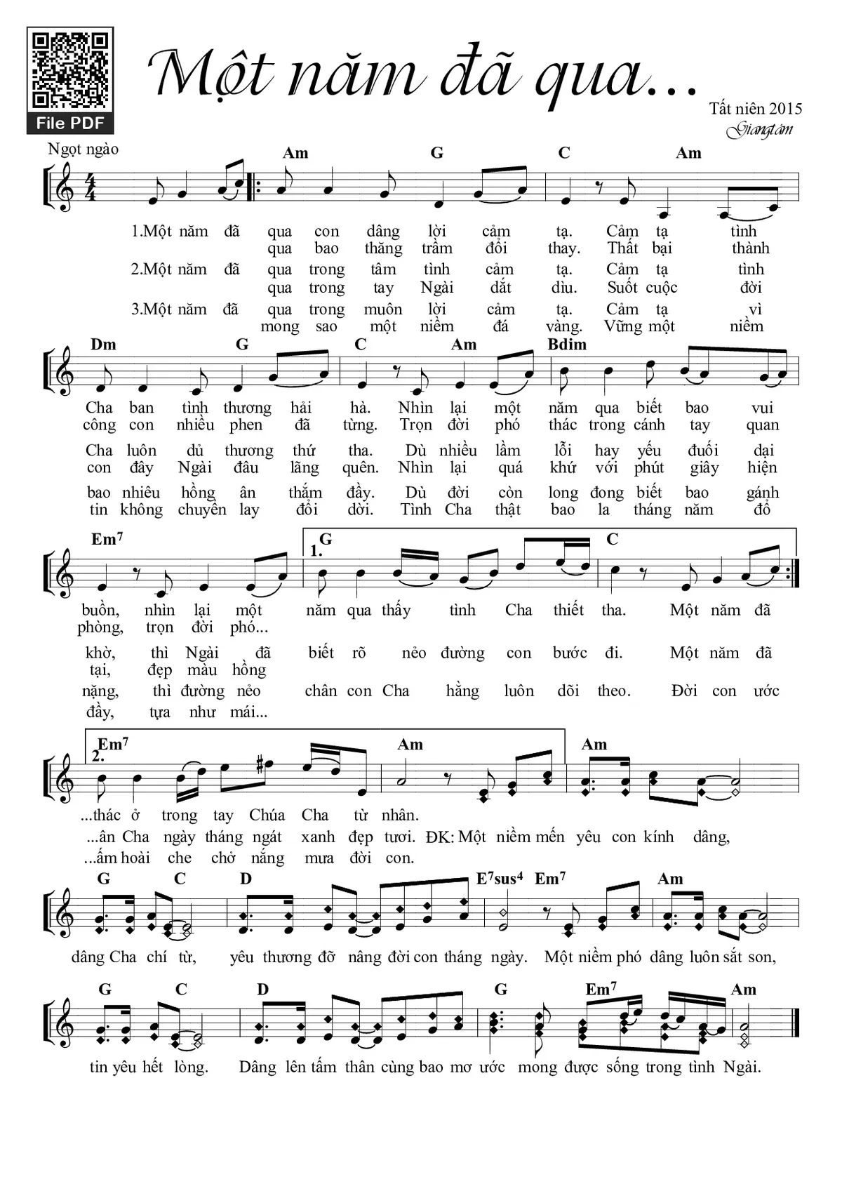 1/ Một năm đã qua con dâng lời cảm tạ. Cảm tạ tình Cha ban, tình thương hải hà. Nhìn lại một năm qua biết bao vui buồn, nhìn lại một năm qua thấy tình Cha thiết tha. Một năm đã qua bao thăng trầm đổi thay. Thất bại thành công con nhiều phen đã từng. Trọn đời phó thác trong cánh tay quan phòng, trọn đời phó thác ở trong tay Chúa Cha từ nhân.