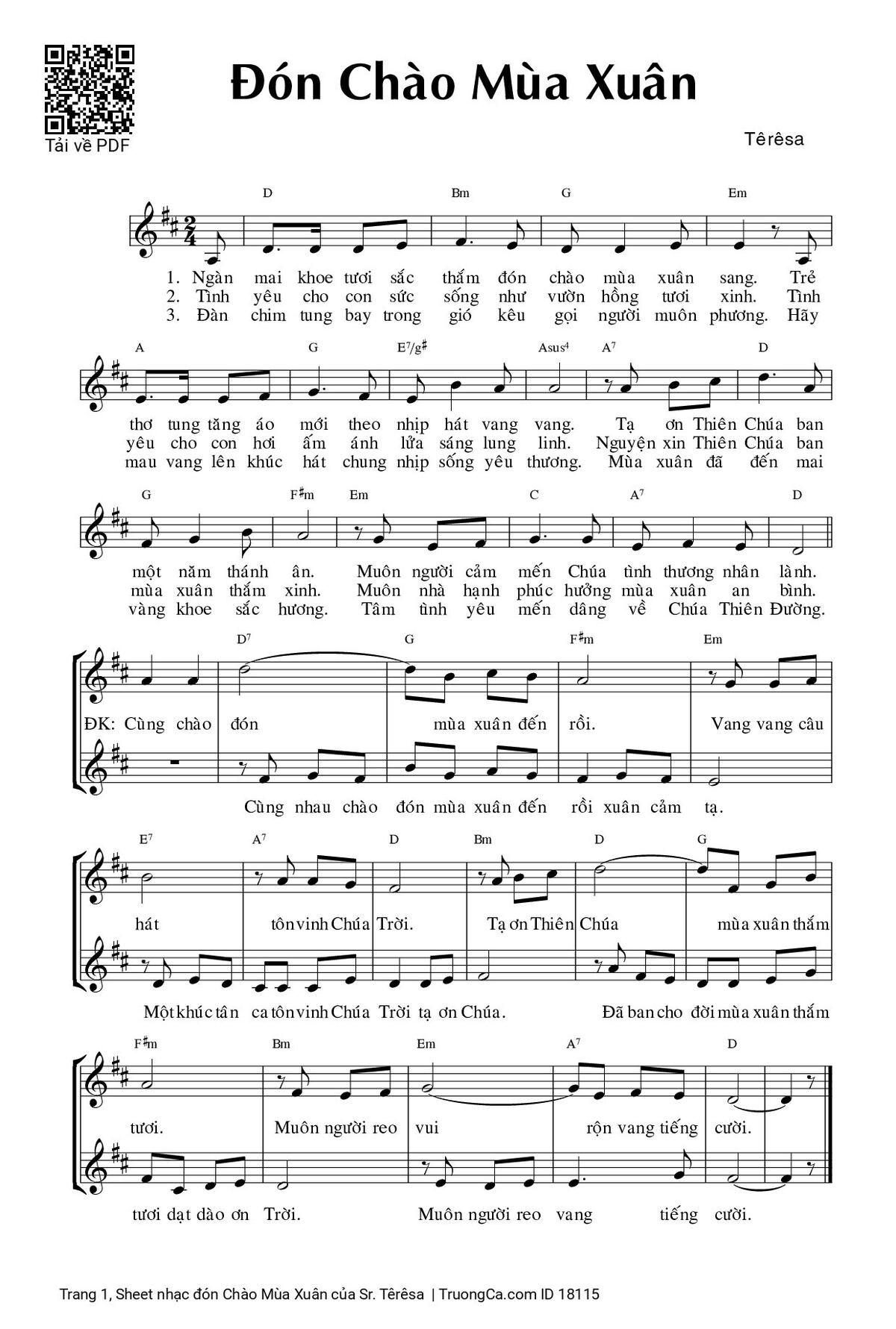 Điệp khúc. Cùng chào đón mùa xuân đến rồi. Vang vang câu hát tôn vinh Chúa Trời. Tạ ơn Thiên Chúa mùa xuân thắm tươi. Muôn người reo vui rộn vang tiếng cười.