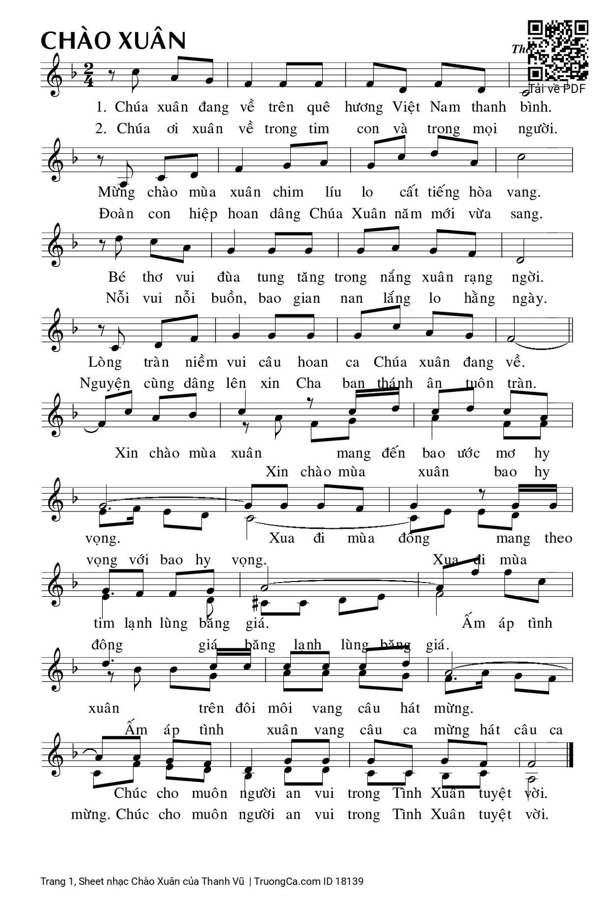 1. Chúa Xuân đang về trên quê hương Việt Nam thanh bình. Mừng chào mùa xuân chim líu lo cất tiếng hòa vang. Bé thơ vui đùa tung tăng trong nắng xuân rạng ngời. Lòng tràn niềm vui câu hoan ca Chúa xuân đang về.
