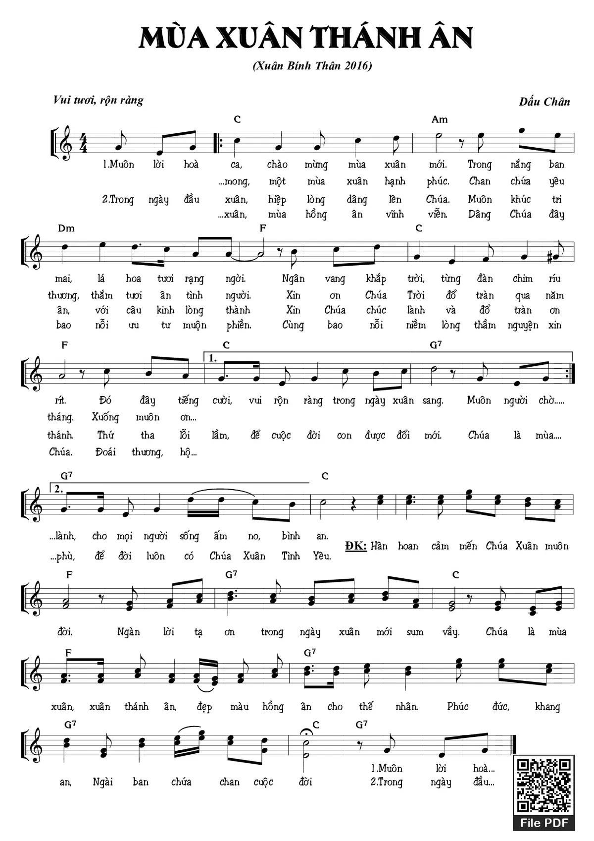 Điệp khúc. Hân hoan cảm mến Chúa Xuân muôn đời. Ngàn lời tạ ơn trong ngày xuân mới sum vầy. Chúa là mùa xuân, xuân thánh ân, đẹp màu hồng ân cho thế nhân. Phúc đức, khang an, Ngài ban chứa chan cuộc đời.
