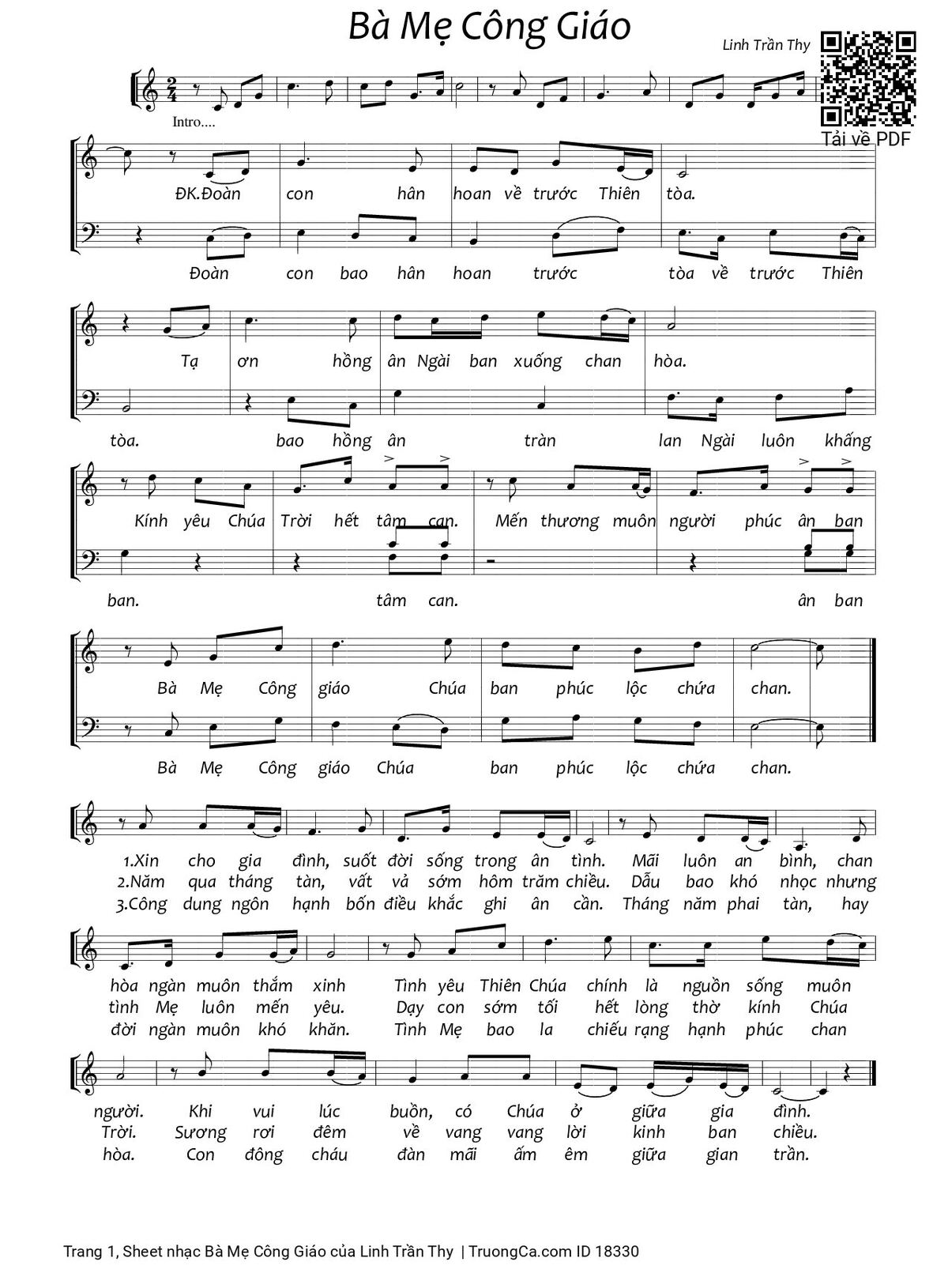 Điệp khúc. Đoàn con hân hoan về trước Thiên tòa. Tạ ơn hồng ân Ngài ban xuống chan hòa. Kính yêu Chúa Trời hết tâm can. Mến thương muôn người phúc ân ban. Bà Mẹ Công Giáo Chúa ban phúc lộc chứa chan.