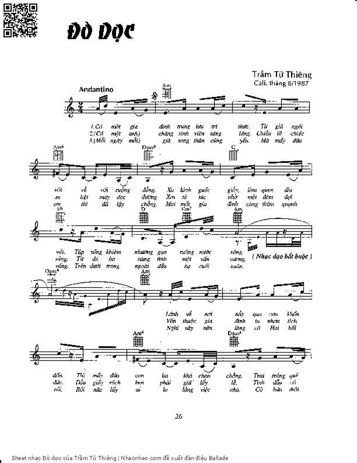 Chọn nút dấu + để tăng tông lên nửa cung, nút dấu - để giảm tông xuống nửa cung. Rê chuột vào hợp âm để xem các thế bấm hợp âm của bài hát Đò dọc.