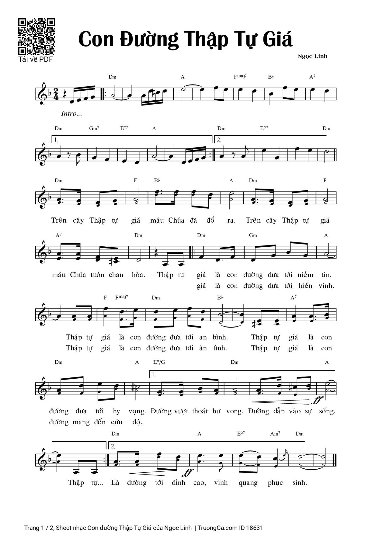 Chọn nút dấu + để tăng tông lên nửa cung, nút dấu - để giảm tông xuống nửa cung. Rê chuột vào hợp âm để xem các thế bấm hợp âm của bài hát Con đường Thập Tự Giá.