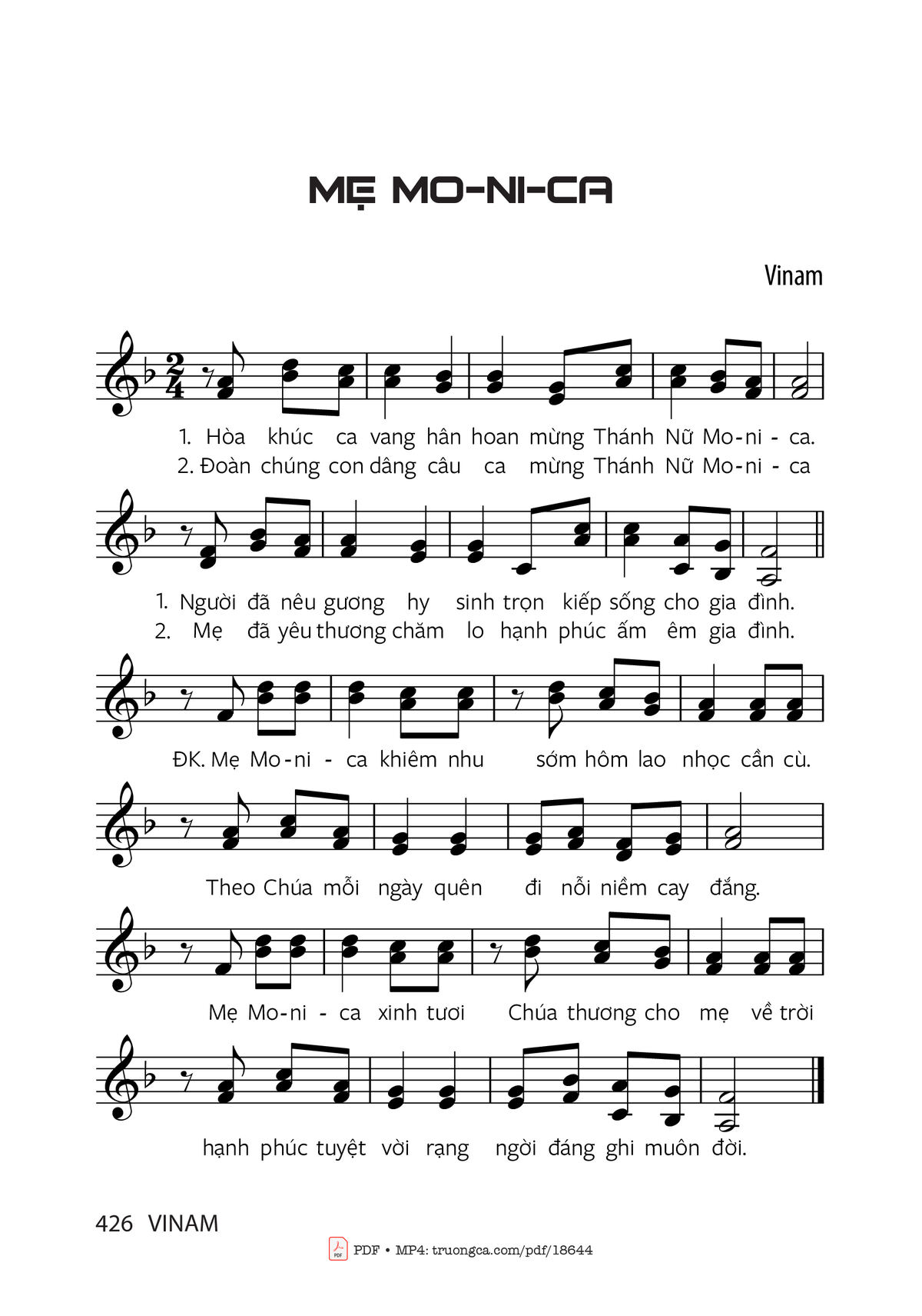 Điệp khúc. Mẹ Monica khiêm nhu sớm hôm lao nhọc cần cù. Theo Chúa mỗi ngày quên đi nỗi niềm cay đắng. Mẹ Monica xinh tươi Chúa thương cho mẹ về trời, hạnh phúc tuyệt vời rạng ngời đáng ghi muôn đời.