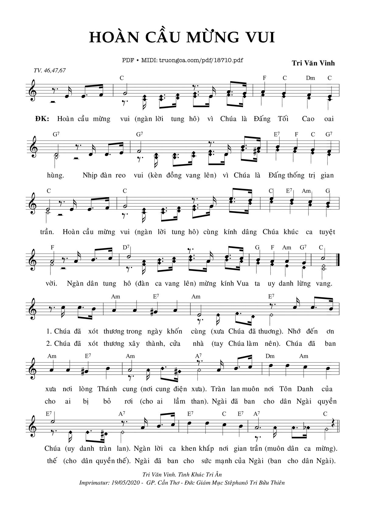 Tri Văn Vinh Hoàn cầu mừng vui vì Chúa là Đấng tối cao oai hùng [PDF] [Sheet] [Lời H.A] [Mp4/Midi]