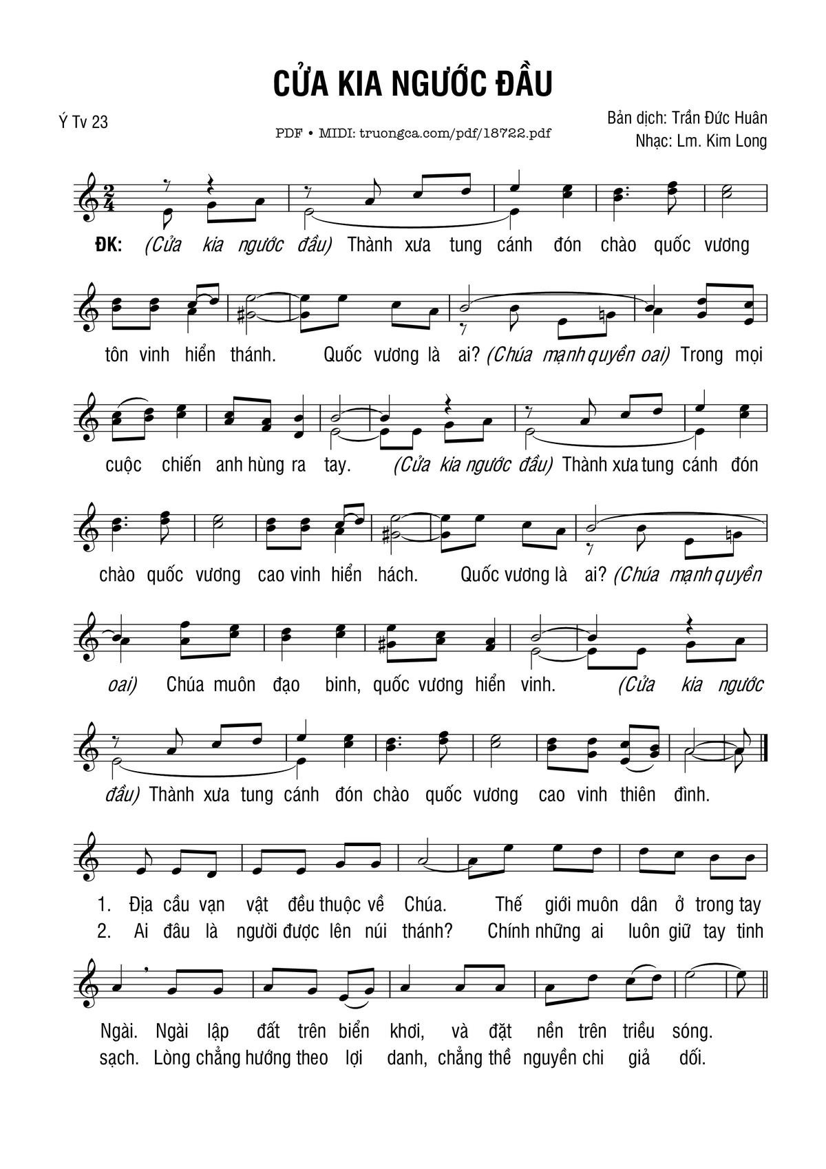 Điệp khúc: (Cửa kia ngước đầu) Thành xưa tung cánh Đón chào quốc vương tôn vinh hiển thánh. Quốc vương là ai? (Chúa mạnh quyền oai) Trong mọi cuộc chiến anh hùng ra tay. (Cửa kia ngước đầu) Thành xưa tung cánh Đón chào quốc vương cao vinh hiển hách. Quốc vương là ai? (Chúa mạnh quyền oai) Chúa muôn đạo binh, quốc vương hiển vinh. Cửa kia ngước đầu Thành xưa tung cánh Đón chào quốc vương cao vinh thiên đình.