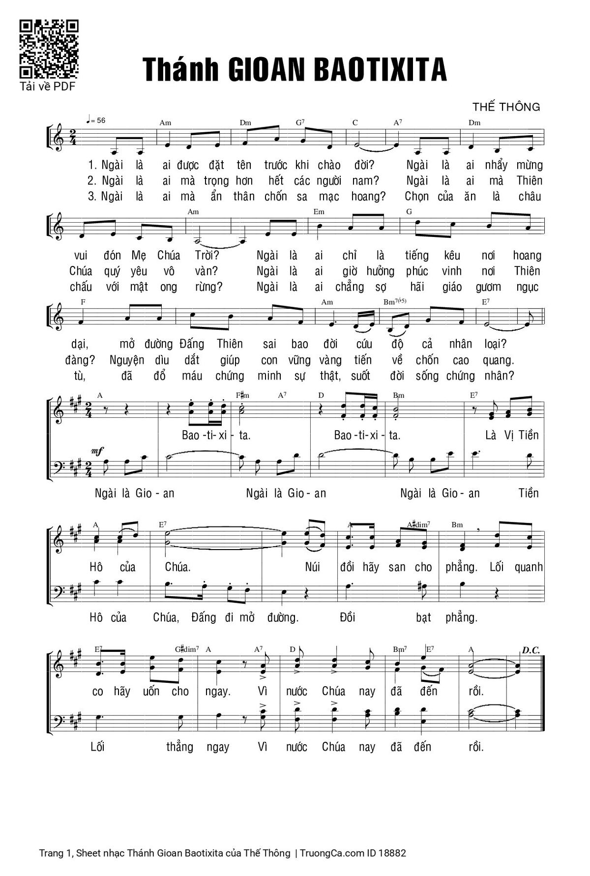 Điệp khúc. Ngài là Gio-an Bao-ti-xi-ta. Ngài là Gio-an Bao-ti-xi-ta. Ngài là Gio-an là Vị Tiền Hô của Chúa. Đấng đi mở đường. Núi đồi hãy san cho phẳng. Lối quanh co hãy uốn cho ngay. Vì Nước Chúa nay đã đến rồi.