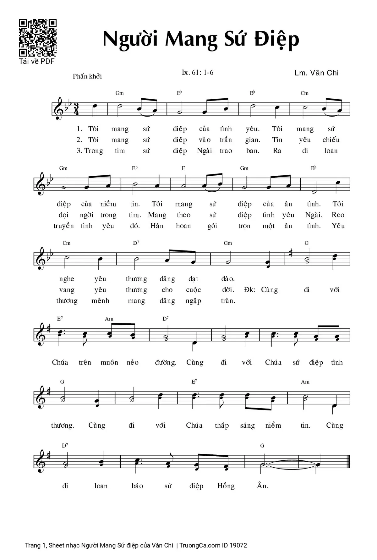 Phần nghe hát Người Mang Sứ điệp (Văn Chi) được nhúng từ Youtube, Musescore hoặc link ngoài và chịu sự kiểm soát bản quyền của bên thứ ba đó, vì vậy có thể bị xóa hoặc chèn quảng cáo bất kỳ lúc nào. Nếu bạn không nghe - xem được ca sĩ hát tức là đã bị Youtube hoặc Musescore kiểm soát.