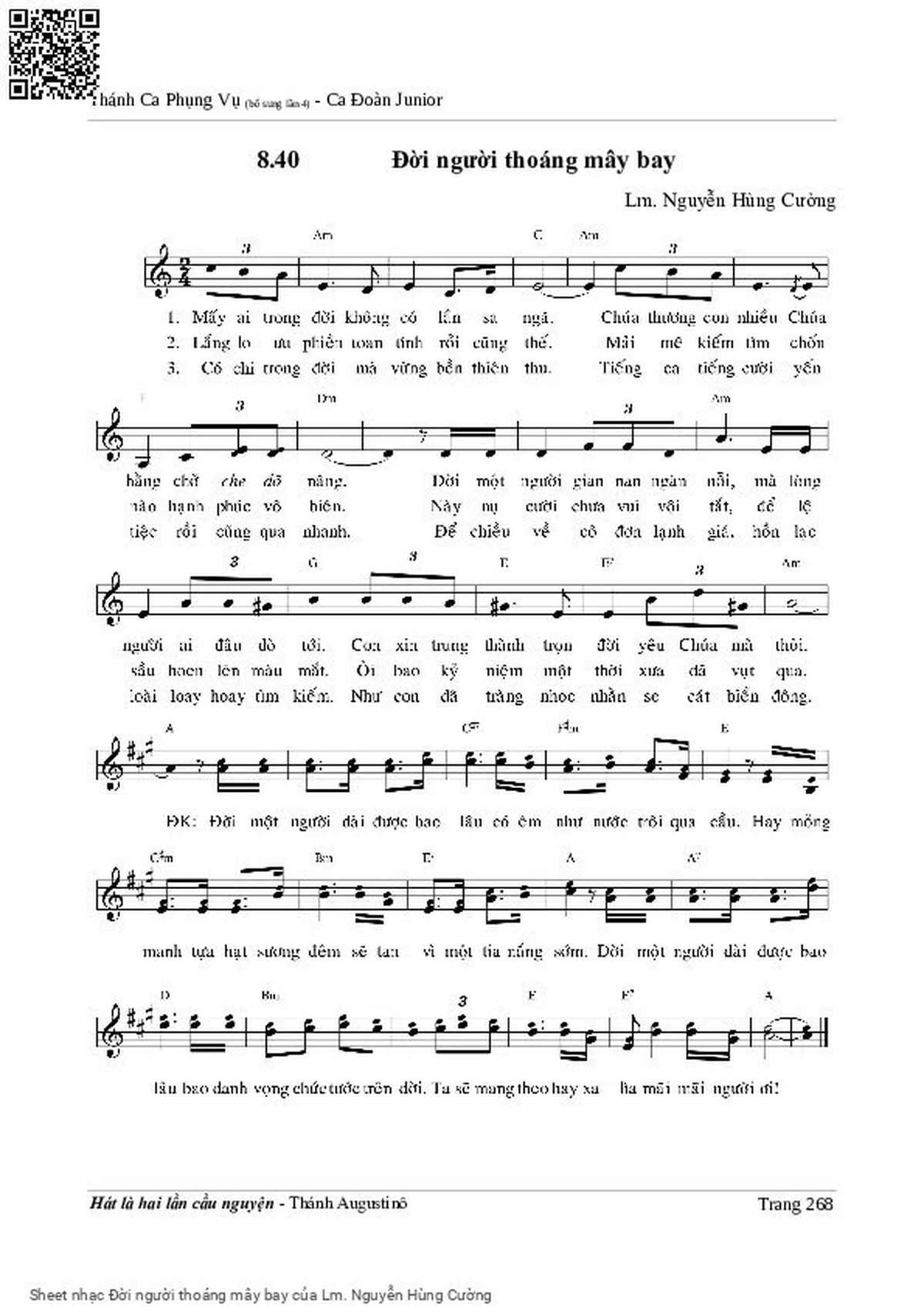 Phần nghe hát Đời người thoáng mây bay (Lm. Nguyễn Hùng Cường) được nhúng từ Youtube, Musescore hoặc link ngoài và chịu sự kiểm soát bản quyền của bên thứ ba đó, vì vậy có thể bị xóa hoặc chèn quảng cáo bất kỳ lúc nào. Nếu bạn không nghe - xem được ca sĩ hát tức là đã bị Youtube hoặc Musescore kiểm soát.
