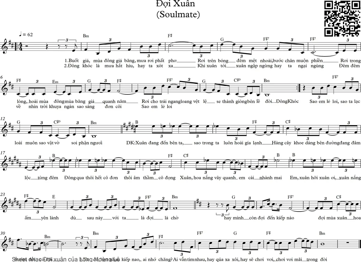 Chọn nút dấu + để tăng tông lên nửa cung, nút dấu - để giảm tông xuống nửa cung. Rê chuột vào hợp âm để xem các thế bấm hợp âm của bài hát Đợi xuân.