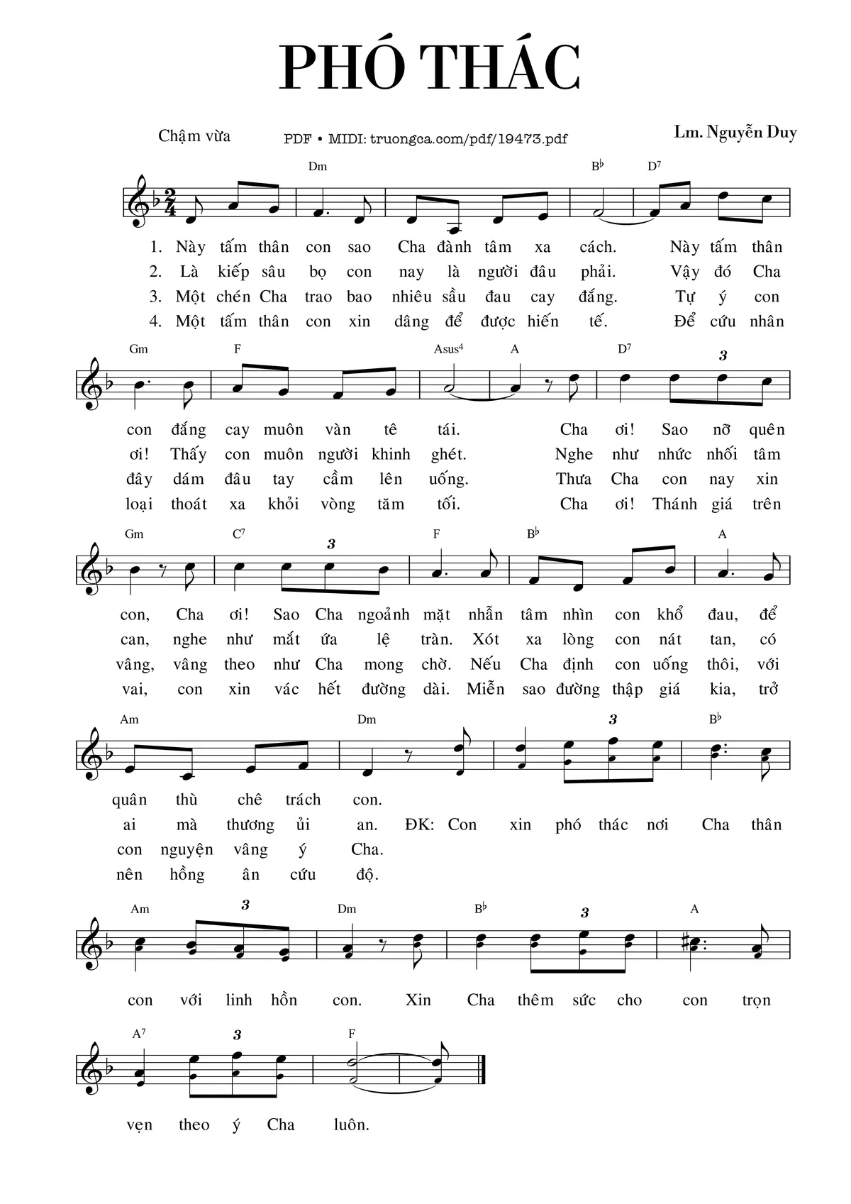 Điệp khúc. Con xin phó thác nơi Cha. Thân con với linh hồn con. Xin Cha thêm sức cho con. Trọn vẹn theo ý Cha luôn.