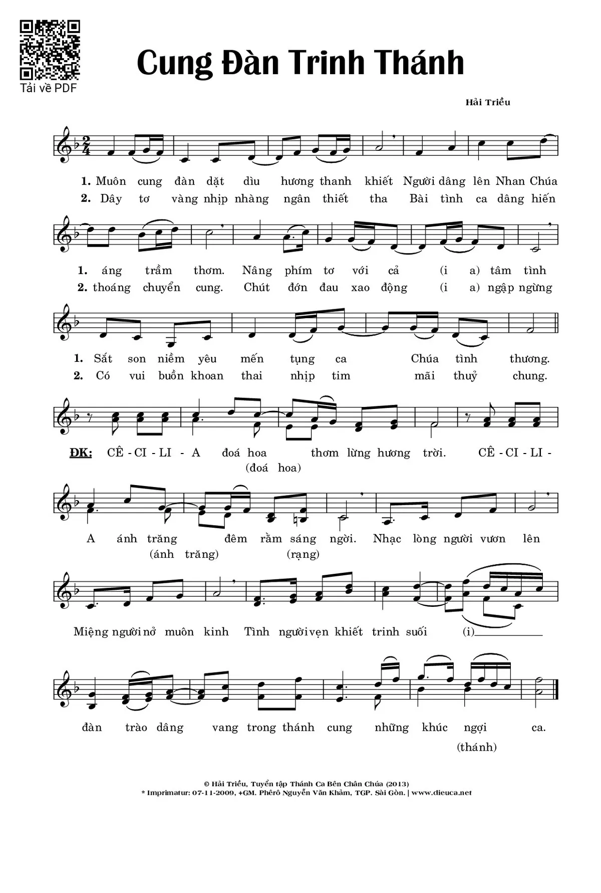 Điệp khúc: CÊ-CI-LI-A đoá hoa thơm lừng hương trời. CÊ-CI-LI-A ánh trăng đêm rằm sáng ngời. Nhạc lòng người vươn lên Miệng người nở muôn kinh Tình người vẹn khiết trinh suối (i) đàn trào dâng vang trong thánh cung những khúc ngợi ca.