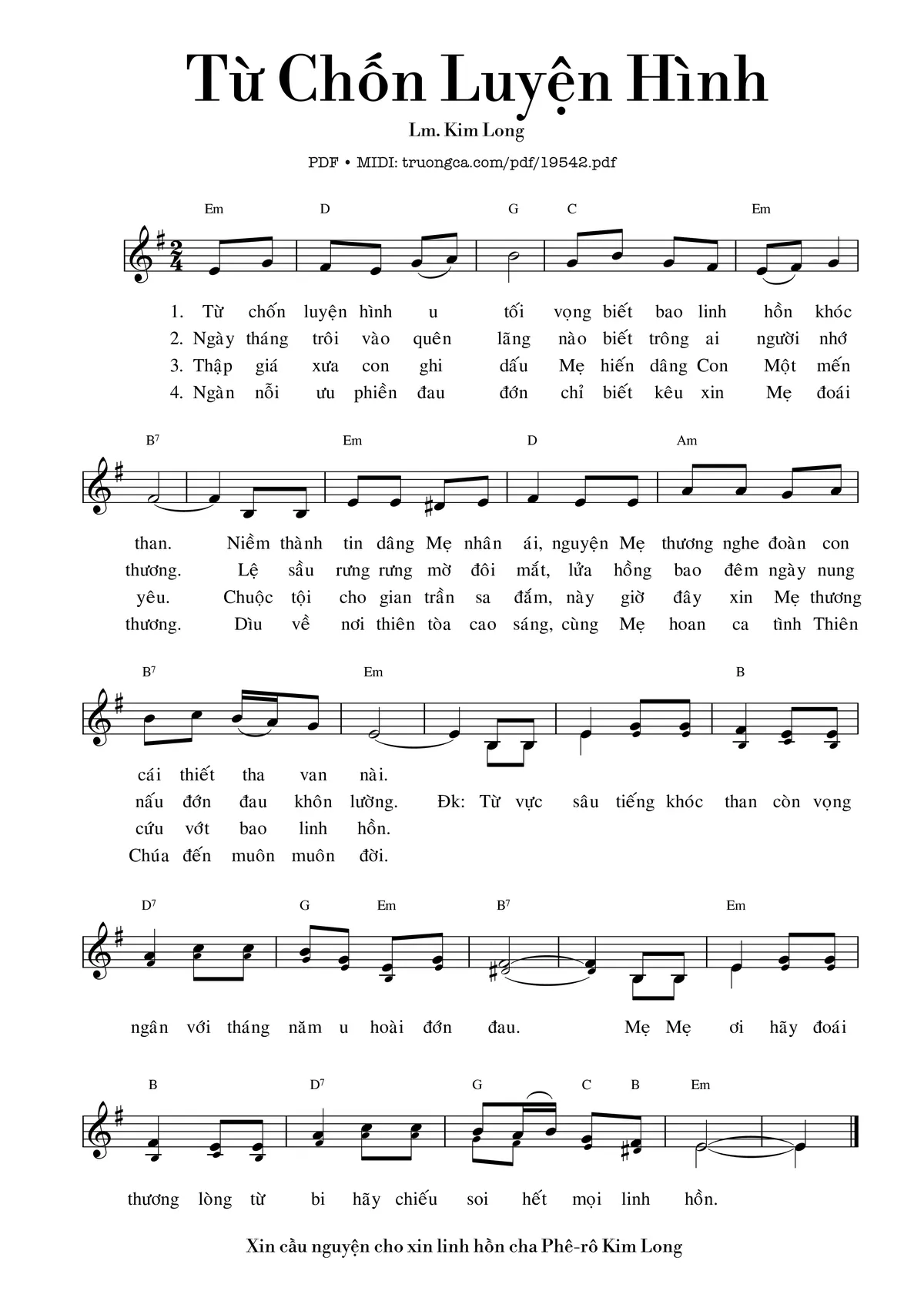 1. [Em] Từ chốn luyện hình u [Bm] tối [G] Vọng tiếng bao linh [C] hồn khóc [B] than Niềm thành [Em] tin dâng Mẹ nhân [Bm] ái… [E7] Nguyện Mẹ [Am] thương nghe đoàn con [B7] cái thiết tha van [Em] nài.