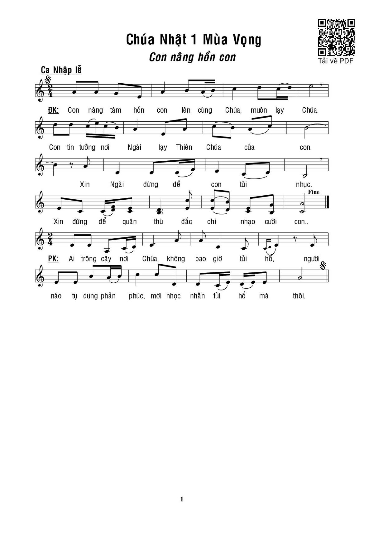 Điệp khúc. Con nâng tâm hồn con lên cùng Chúa, lạy Chúa. Con tin tưởng nơi Ngài lạy Thiên Chúa của con. Xin Ngài đừng để con tủi nhục. Xin đừng để quân thù đắc chí nhạo cười con.