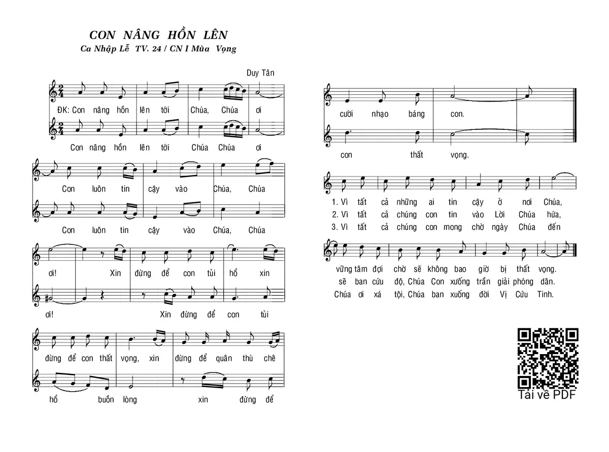 Điệp khúc. Con nâng hồn lên tới Chúa, Chúa ơi Con luôn tin cậy vào Chúa, Chúa ơi! Xin đừng để con tủi hổ xin đừng để con thất vọng, xin đừng để quân thù chê cười nhạo báng con.