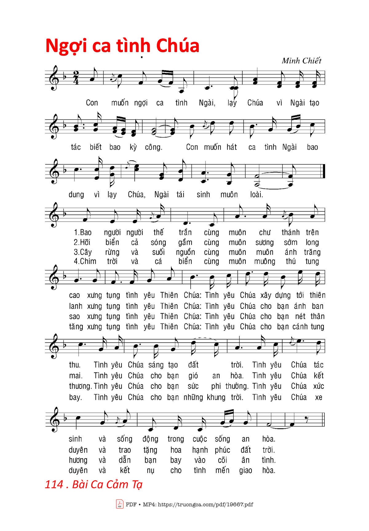 Phần nghe hát Ngợi Ca Tình Chúa (Minh Chiết) được nhúng từ Youtube, Musescore hoặc link ngoài và chịu sự kiểm soát bản quyền của bên thứ ba đó, vì vậy có thể bị xóa hoặc chèn quảng cáo bất kỳ lúc nào. Nếu bạn không nghe - xem được ca sĩ hát tức là đã bị Youtube hoặc Musescore kiểm soát.