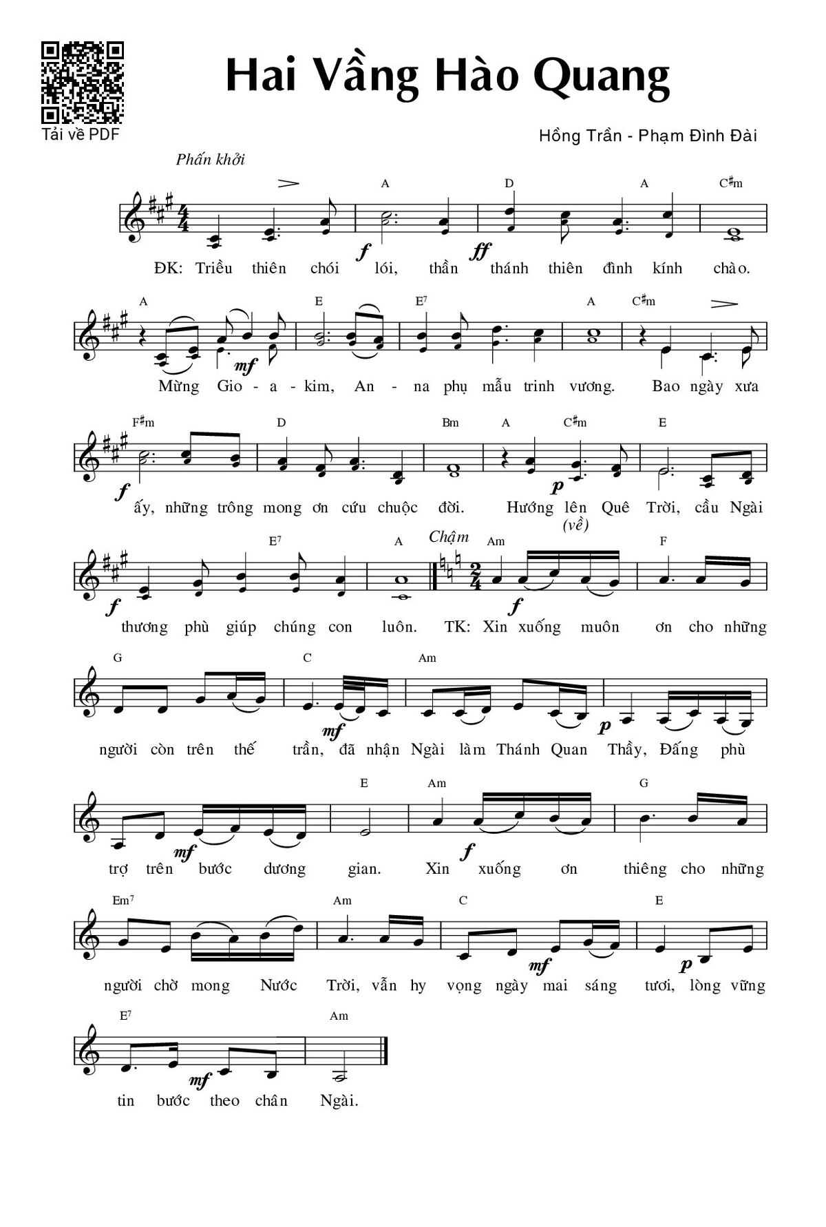 Sheet nhạc có nốt Hai vầng hào quang của nhạc sĩ Phạm Đình Đài và file PDF nốt nhạc đăng lên đây nhằm giúp các bạn xướng âm cho đúng nốt và hát thêm hay, chỉ mang tính chất tham khảo, không có mục đích thương mại. Bản quyền thuộc về tác giả và tổ chức nắm bản quyền, Truongca.com không giữ bất kỳ bản quyền của nội dung nào cả. Các bạn có thể tải về bản PDF chất lượng cao, gồm khuông nhạc có nốt với đường link file PDF bên trên.