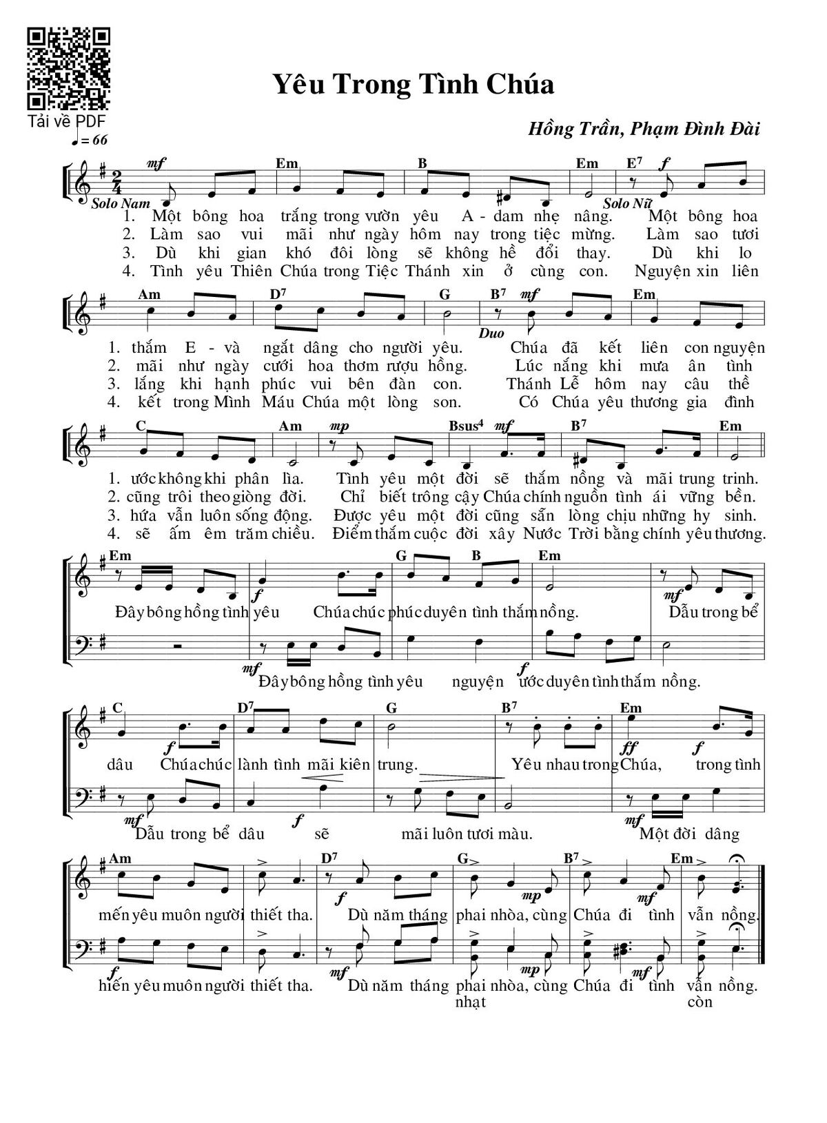 Sheet nhạc có nốt Yêu trong tình Chúa của nhạc sĩ Phạm Đình Đài và file PDF nốt nhạc đăng lên đây nhằm giúp các bạn xướng âm cho đúng nốt và hát thêm hay, chỉ mang tính chất tham khảo, không có mục đích thương mại. Bản quyền thuộc về tác giả và tổ chức nắm bản quyền, Truongca.com không giữ bất kỳ bản quyền của nội dung nào cả. Các bạn có thể tải về bản PDF chất lượng cao, gồm khuông nhạc có nốt với đường link file PDF bên trên.