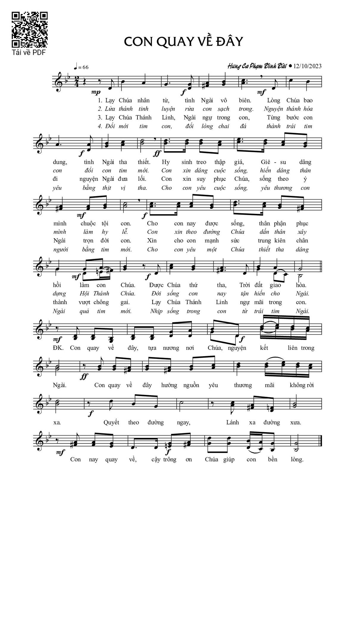 Sheet nhạc có nốt Con quay về đây của nhạc sĩ Phạm Đình Đài và file PDF nốt nhạc đăng lên đây nhằm giúp các bạn xướng âm cho đúng nốt và hát thêm hay, chỉ mang tính chất tham khảo, không có mục đích thương mại. Bản quyền thuộc về tác giả và tổ chức nắm bản quyền, Truongca.com không giữ bất kỳ bản quyền của nội dung nào cả. Các bạn có thể tải về bản PDF chất lượng cao, gồm khuông nhạc có nốt với đường link file PDF bên trên.