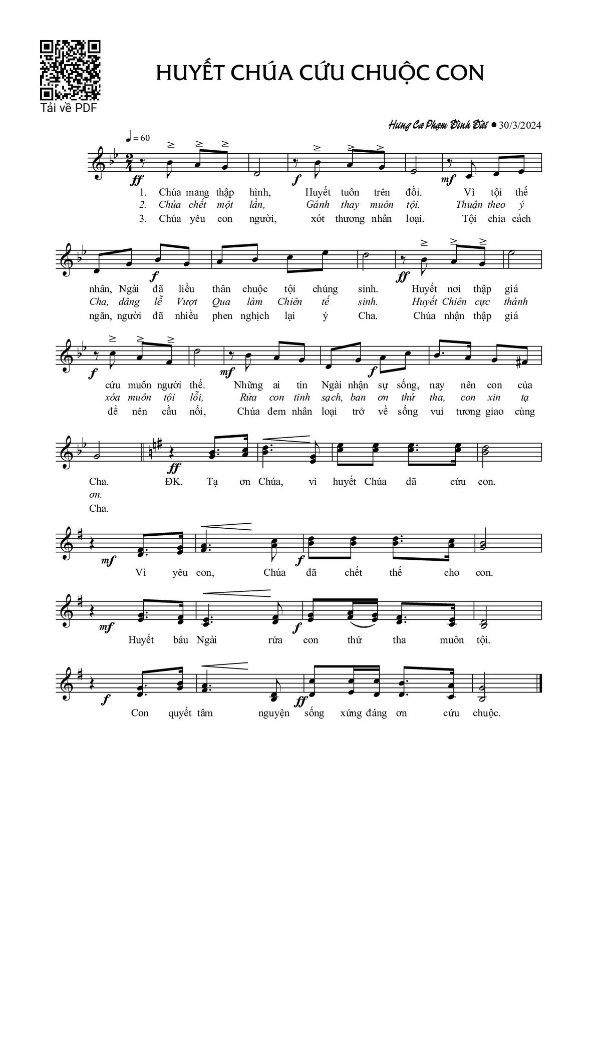 Sheet nhạc có nốt Huyết Chúa cứu chuộc con của nhạc sĩ Phạm Đình Đài và file PDF nốt nhạc đăng lên đây nhằm giúp các bạn xướng âm cho đúng nốt và hát thêm hay, chỉ mang tính chất tham khảo, không có mục đích thương mại. Bản quyền thuộc về tác giả và tổ chức nắm bản quyền, Truongca.com không giữ bất kỳ bản quyền của nội dung nào cả. Các bạn có thể tải về bản PDF chất lượng cao, gồm khuông nhạc có nốt với đường link file PDF bên trên.