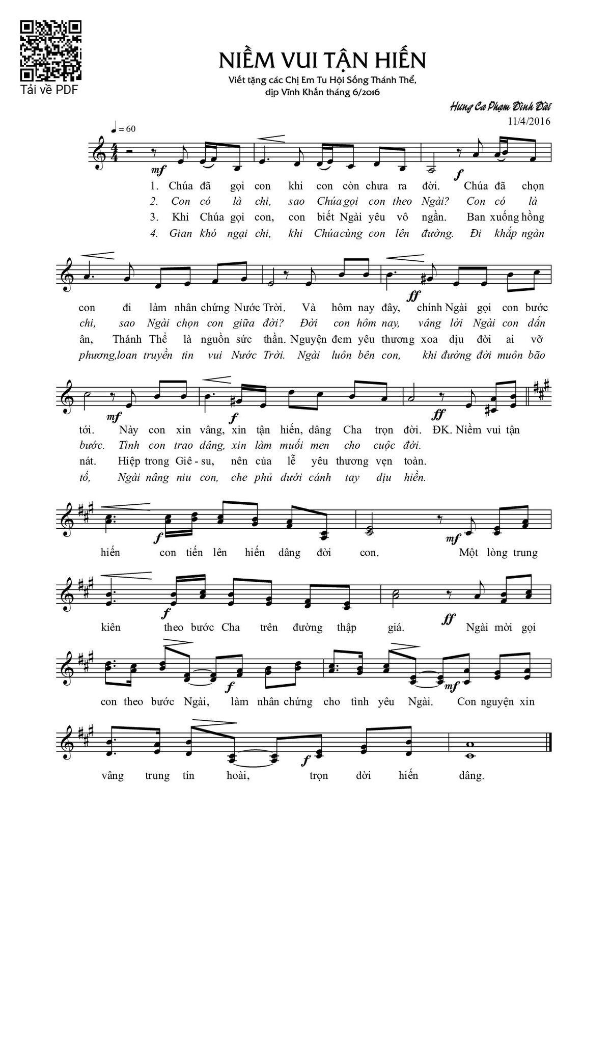Sheet nhạc có nốt Niềm vui tận hiến của nhạc sĩ Phạm Đình Đài và file PDF nốt nhạc đăng lên đây nhằm giúp các bạn xướng âm cho đúng nốt và hát thêm hay, chỉ mang tính chất tham khảo, không có mục đích thương mại. Bản quyền thuộc về tác giả và tổ chức nắm bản quyền, Truongca.com không giữ bất kỳ bản quyền của nội dung nào cả. Các bạn có thể tải về bản PDF chất lượng cao, gồm khuông nhạc có nốt với đường link file PDF bên trên.