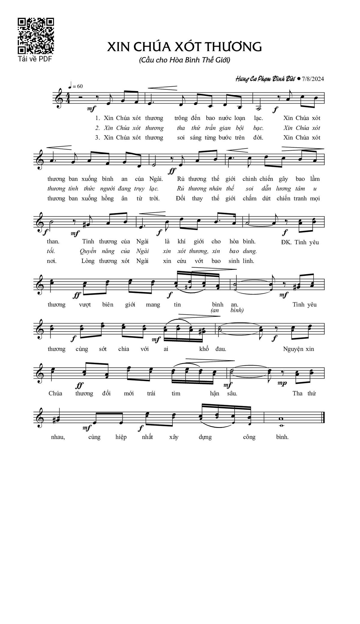 Sheet nhạc có nốt Xin Chúa xót thương của nhạc sĩ Phạm Đình Đài và file PDF nốt nhạc đăng lên đây nhằm giúp các bạn xướng âm cho đúng nốt và hát thêm hay, chỉ mang tính chất tham khảo, không có mục đích thương mại. Bản quyền thuộc về tác giả và tổ chức nắm bản quyền, Truongca.com không giữ bất kỳ bản quyền của nội dung nào cả. Các bạn có thể tải về bản PDF chất lượng cao, gồm khuông nhạc có nốt với đường link file PDF bên trên.
