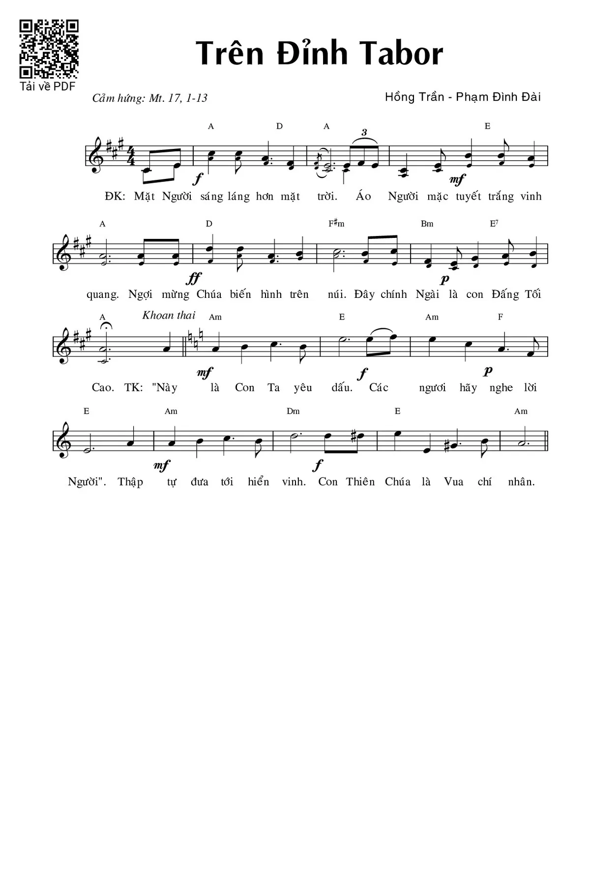 Điệp khúc. Mặt Người sáng láng hơn mặt trời. Áo Người mặc tuyết trắng vinh quang. Ngợi mừng Chúa biến hình trên núi. Đây chính Ngài là con Đấng Tối Cao.