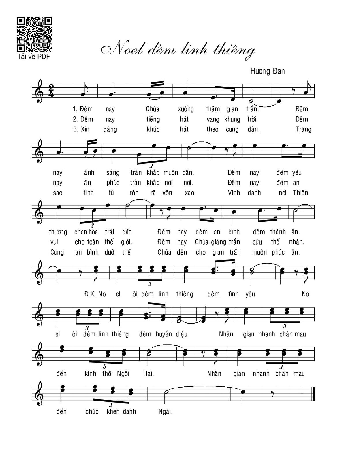 Sheet nhạc có nốt Noel đêm linh thiêng của nhạc sĩ Hương Đan và file PDF nốt nhạc đăng lên đây nhằm giúp các bạn xướng âm cho đúng nốt và hát thêm hay, chỉ mang tính chất tham khảo, không có mục đích thương mại. Bản quyền thuộc về tác giả và tổ chức nắm bản quyền, Truongca.com không giữ bất kỳ bản quyền của nội dung nào cả. Các bạn có thể tải về bản PDF chất lượng cao, gồm khuông nhạc có nốt với đường link file PDF bên trên.