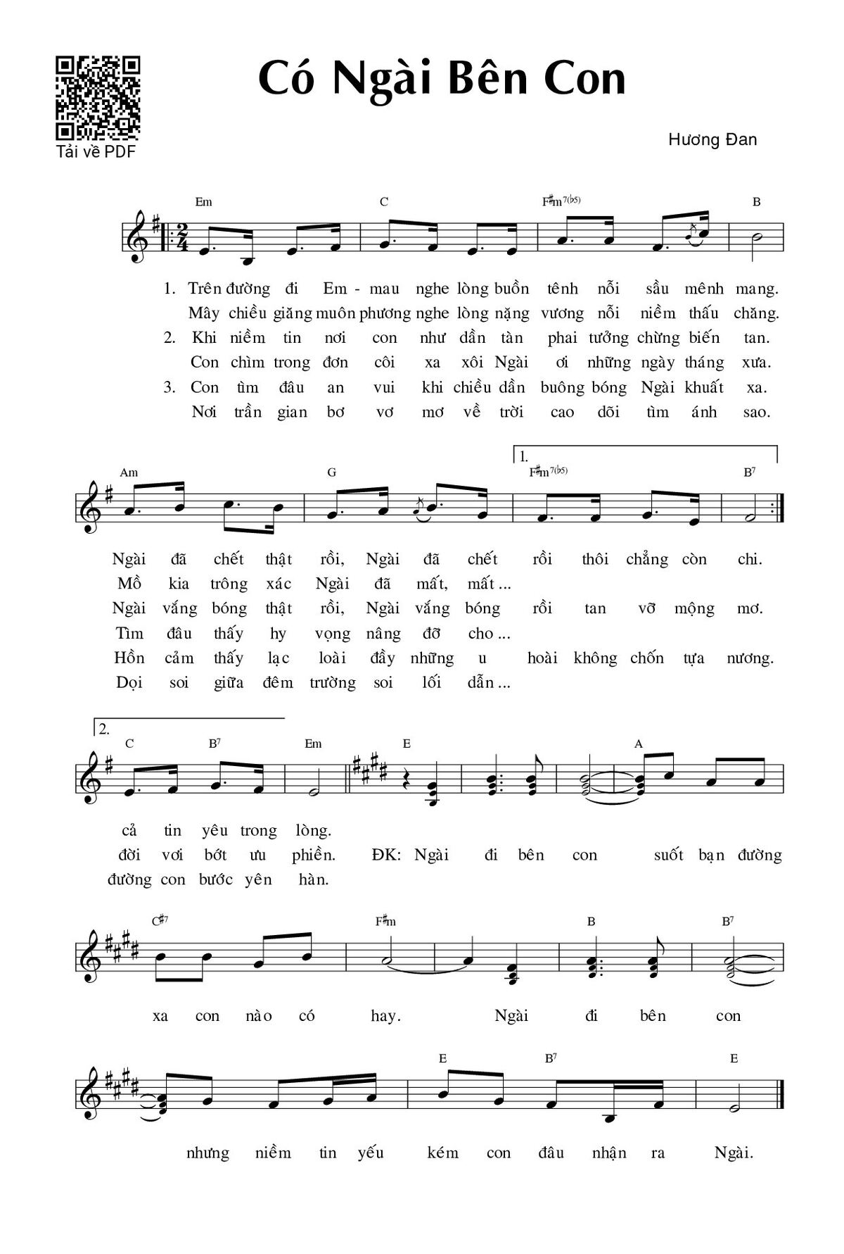 Sheet nhạc có nốt Có Ngài bên con của nhạc sĩ Hương Đan và file PDF nốt nhạc đăng lên đây nhằm giúp các bạn xướng âm cho đúng nốt và hát thêm hay, chỉ mang tính chất tham khảo, không có mục đích thương mại. Bản quyền thuộc về tác giả và tổ chức nắm bản quyền, Truongca.com không giữ bất kỳ bản quyền của nội dung nào cả. Các bạn có thể tải về bản PDF chất lượng cao, gồm khuông nhạc có nốt với đường link file PDF bên trên.
