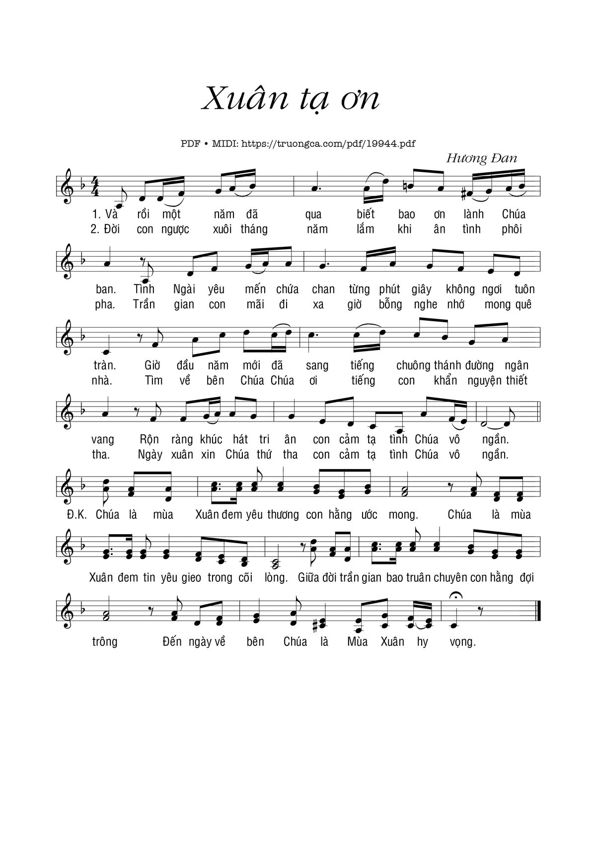 Sheet nhạc có nốt Xuân tạ ơn của nhạc sĩ Hương Đan và file PDF nốt nhạc đăng lên đây nhằm giúp các bạn xướng âm cho đúng nốt và hát thêm hay, chỉ mang tính chất tham khảo, không có mục đích thương mại. Bản quyền thuộc về tác giả và tổ chức nắm bản quyền, Truongca.com không giữ bất kỳ bản quyền của nội dung nào cả. Các bạn có thể tải về bản PDF chất lượng cao, gồm khuông nhạc có nốt với đường link file PDF bên trên.
