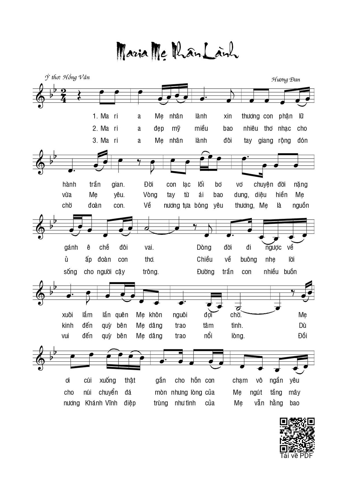 Sheet nhạc có nốt Maria Mẹ Nhân Lành của nhạc sĩ Hương Đan và file PDF nốt nhạc đăng lên đây nhằm giúp các bạn xướng âm cho đúng nốt và hát thêm hay, chỉ mang tính chất tham khảo, không có mục đích thương mại. Bản quyền thuộc về tác giả và tổ chức nắm bản quyền, Truongca.com không giữ bất kỳ bản quyền của nội dung nào cả. Các bạn có thể tải về bản PDF chất lượng cao, gồm khuông nhạc có nốt với đường link file PDF bên trên.
