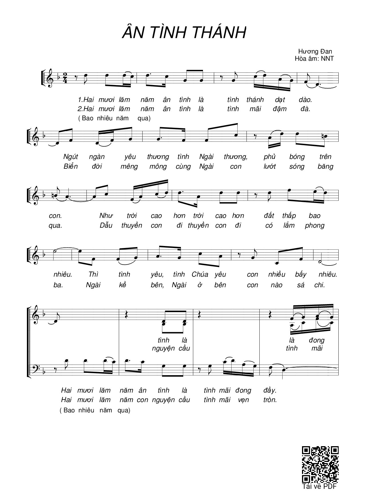 Sheet nhạc có nốt Ân tình thánh (3 bè) của nhạc sĩ Hương Đan và file PDF nốt nhạc đăng lên đây nhằm giúp các bạn xướng âm cho đúng nốt và hát thêm hay, chỉ mang tính chất tham khảo, không có mục đích thương mại. Bản quyền thuộc về tác giả và tổ chức nắm bản quyền, Truongca.com không giữ bất kỳ bản quyền của nội dung nào cả. Các bạn có thể tải về bản PDF chất lượng cao, gồm khuông nhạc có nốt với đường link file PDF bên trên.