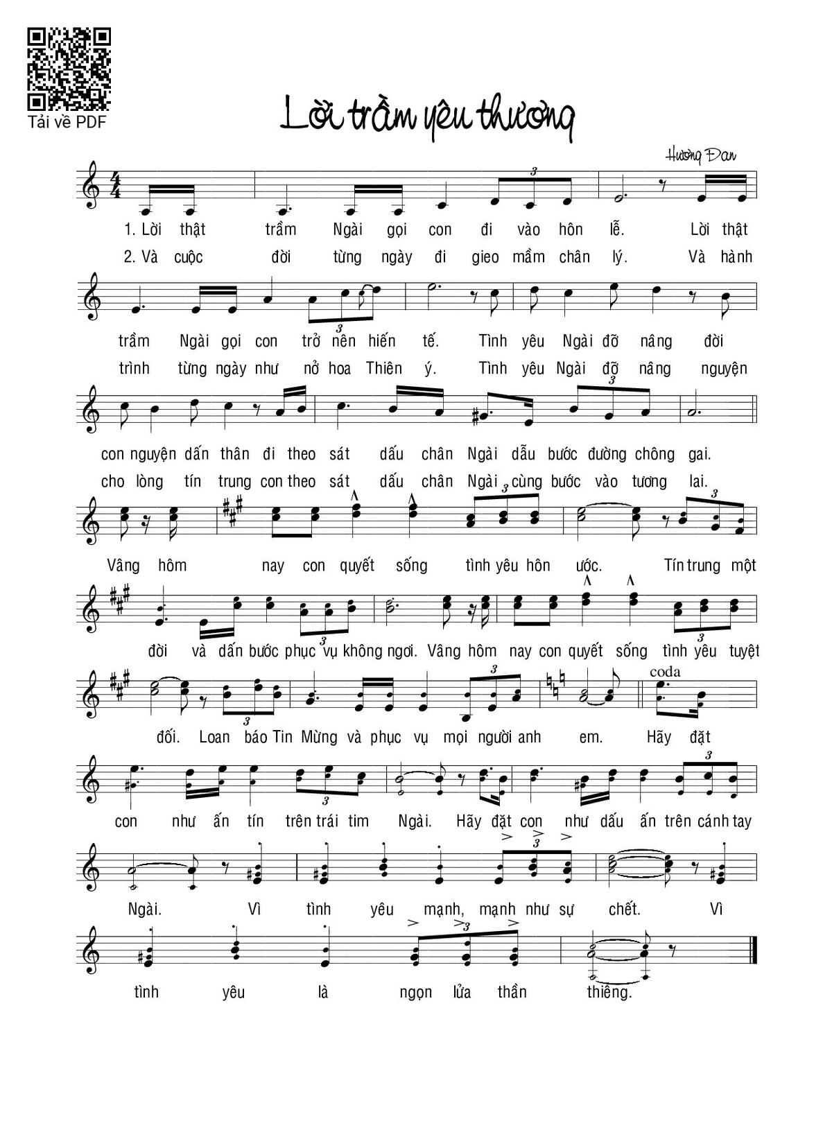 Sheet nhạc có nốt Lời trầm yêu thương của nhạc sĩ Hương Đan và file PDF nốt nhạc đăng lên đây nhằm giúp các bạn xướng âm cho đúng nốt và hát thêm hay, chỉ mang tính chất tham khảo, không có mục đích thương mại. Bản quyền thuộc về tác giả và tổ chức nắm bản quyền, Truongca.com không giữ bất kỳ bản quyền của nội dung nào cả. Các bạn có thể tải về bản PDF chất lượng cao, gồm khuông nhạc có nốt với đường link file PDF bên trên.