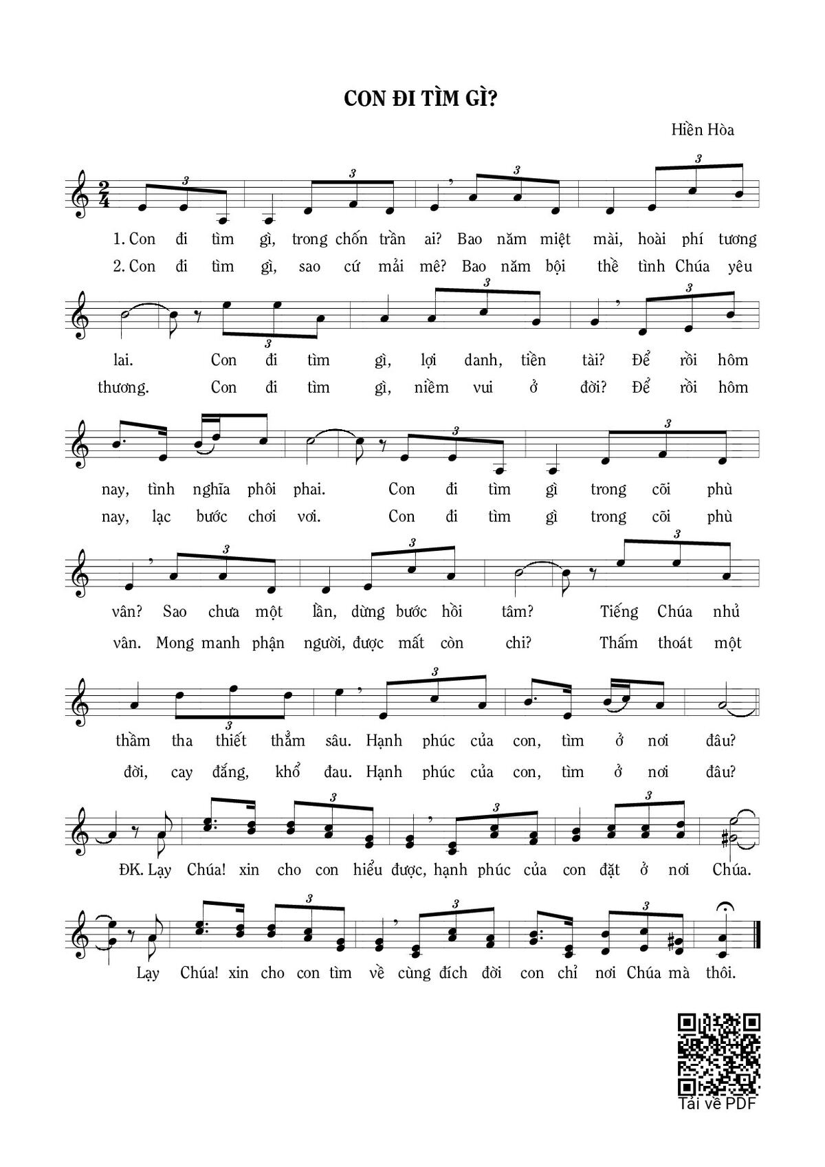 Sheet nhạc có nốt Con đi tìm gì? của nhạc sĩ Hiền Hòa và file PDF nốt nhạc đăng lên đây nhằm giúp các bạn xướng âm cho đúng nốt và hát thêm hay, chỉ mang tính chất tham khảo, không có mục đích thương mại. Bản quyền thuộc về tác giả và tổ chức nắm bản quyền, Truongca.com không giữ bất kỳ bản quyền của nội dung nào cả. Các bạn có thể tải về bản PDF chất lượng cao, gồm khuông nhạc có nốt với đường link file PDF bên trên.