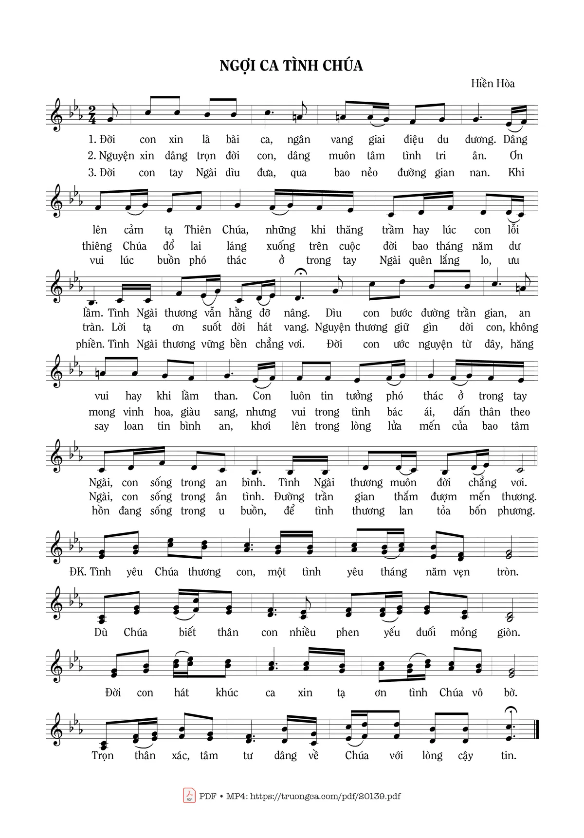 Sheet nhạc có nốt Ngợi ca tình Chúa của nhạc sĩ Hiền Hòa và file PDF nốt nhạc đăng lên đây nhằm giúp các bạn xướng âm cho đúng nốt và hát thêm hay, chỉ mang tính chất tham khảo, không có mục đích thương mại. Bản quyền thuộc về tác giả và tổ chức nắm bản quyền, Truongca.com không giữ bất kỳ bản quyền của nội dung nào cả. Các bạn có thể tải về bản PDF chất lượng cao, gồm khuông nhạc có nốt với đường link file PDF bên trên.