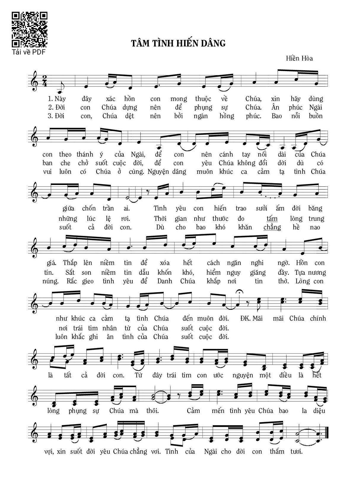 Sheet nhạc có nốt Tâm tình hiến dâng của nhạc sĩ Hiền Hòa và file PDF nốt nhạc đăng lên đây nhằm giúp các bạn xướng âm cho đúng nốt và hát thêm hay, chỉ mang tính chất tham khảo, không có mục đích thương mại. Bản quyền thuộc về tác giả và tổ chức nắm bản quyền, Truongca.com không giữ bất kỳ bản quyền của nội dung nào cả. Các bạn có thể tải về bản PDF chất lượng cao, gồm khuông nhạc có nốt với đường link file PDF bên trên.
