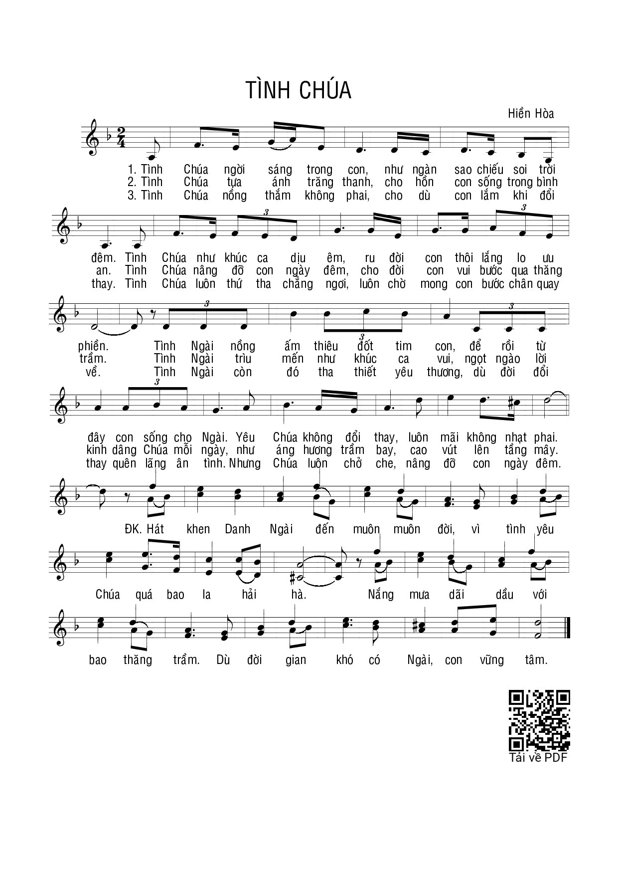 Sheet nhạc có nốt Tình Chúa của nhạc sĩ Hiền Hòa và file PDF nốt nhạc đăng lên đây nhằm giúp các bạn xướng âm cho đúng nốt và hát thêm hay, chỉ mang tính chất tham khảo, không có mục đích thương mại. Bản quyền thuộc về tác giả và tổ chức nắm bản quyền, Truongca.com không giữ bất kỳ bản quyền của nội dung nào cả. Các bạn có thể tải về bản PDF chất lượng cao, gồm khuông nhạc có nốt với đường link file PDF bên trên.