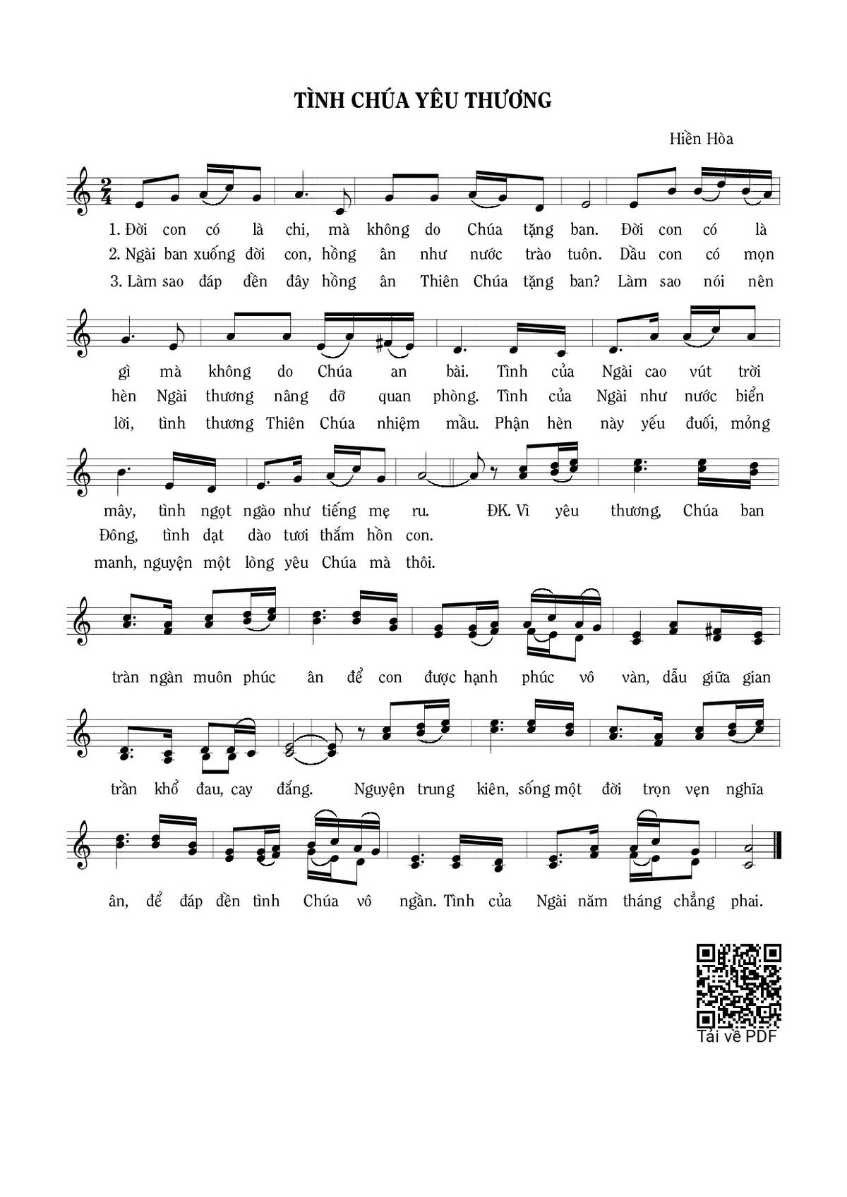 Sheet nhạc có nốt Tình Chúa yêu thương 2  của nhạc sĩ Hiền Hòa và file PDF nốt nhạc đăng lên đây nhằm giúp các bạn xướng âm cho đúng nốt và hát thêm hay, chỉ mang tính chất tham khảo, không có mục đích thương mại. Bản quyền thuộc về tác giả và tổ chức nắm bản quyền, Truongca.com không giữ bất kỳ bản quyền của nội dung nào cả. Các bạn có thể tải về bản PDF chất lượng cao, gồm khuông nhạc có nốt với đường link file PDF bên trên.