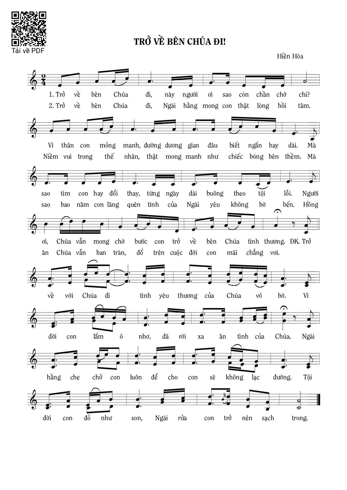 Sheet nhạc có nốt Trở về bên Chúa đi! của nhạc sĩ Hiền Hòa và file PDF nốt nhạc đăng lên đây nhằm giúp các bạn xướng âm cho đúng nốt và hát thêm hay, chỉ mang tính chất tham khảo, không có mục đích thương mại. Bản quyền thuộc về tác giả và tổ chức nắm bản quyền, Truongca.com không giữ bất kỳ bản quyền của nội dung nào cả. Các bạn có thể tải về bản PDF chất lượng cao, gồm khuông nhạc có nốt với đường link file PDF bên trên.