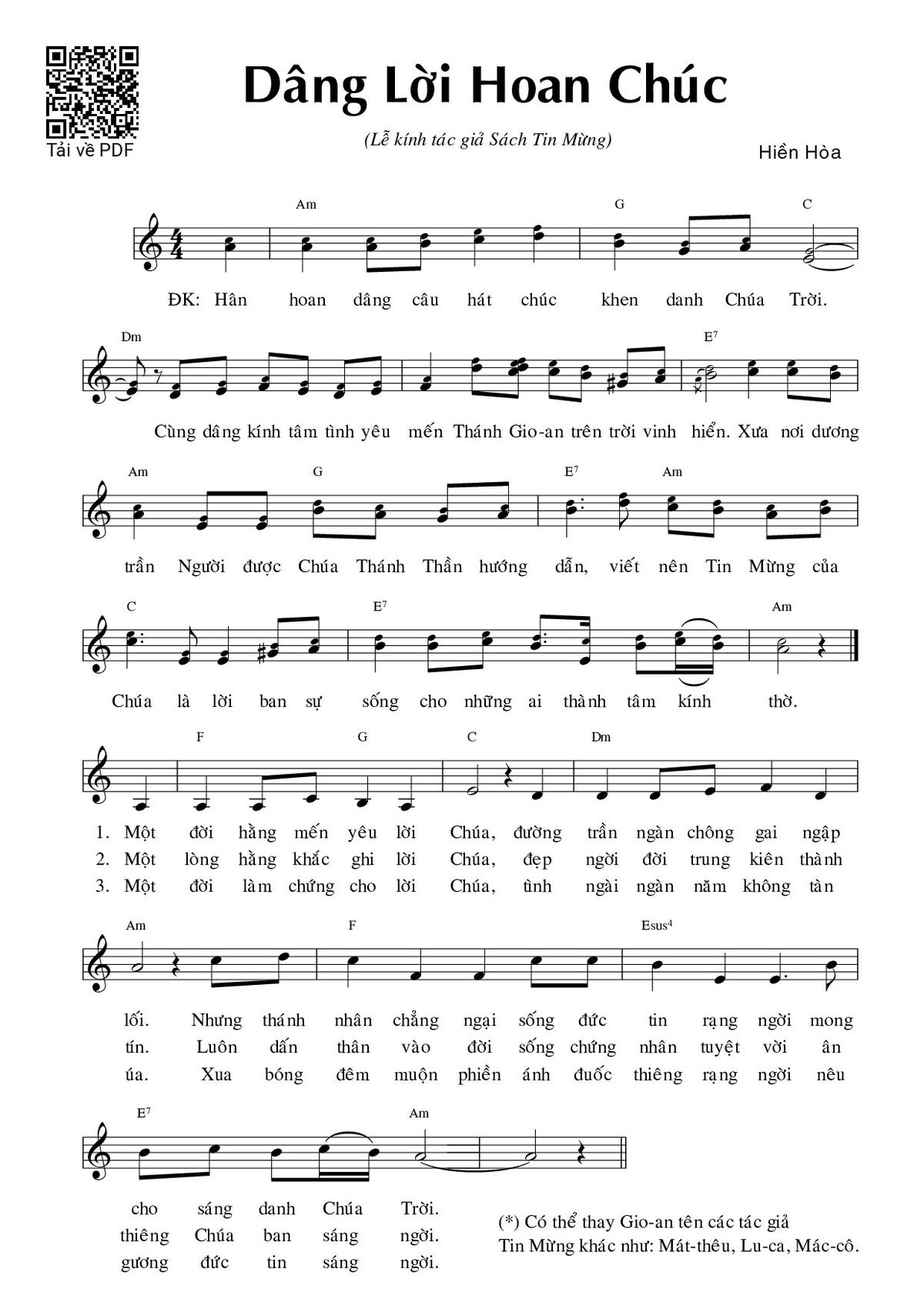 Trang 1 của Sheet nhạc PDF bài hát Dâng lời hoan chúc - Hiền Hòa