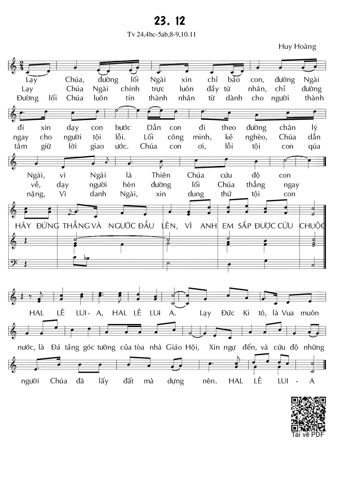 Lạy Chúa Ngài chính trực luôn đầy từ nhân, chỉ đường ngay cho người tội lỗi. Lối công minh, kẻ nghèo, Chúa dẫn về, dạy người hèn đường lối Chúa thẳng ngay