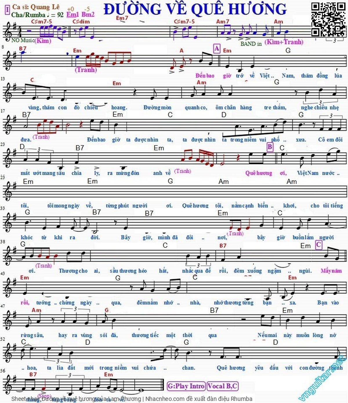 Chọn nút dấu + để tăng tông lên nửa cung, nút dấu - để giảm tông xuống nửa cung. Rê chuột vào hợp âm để xem các thế bấm hợp âm của bài hát Đường về quê hương.