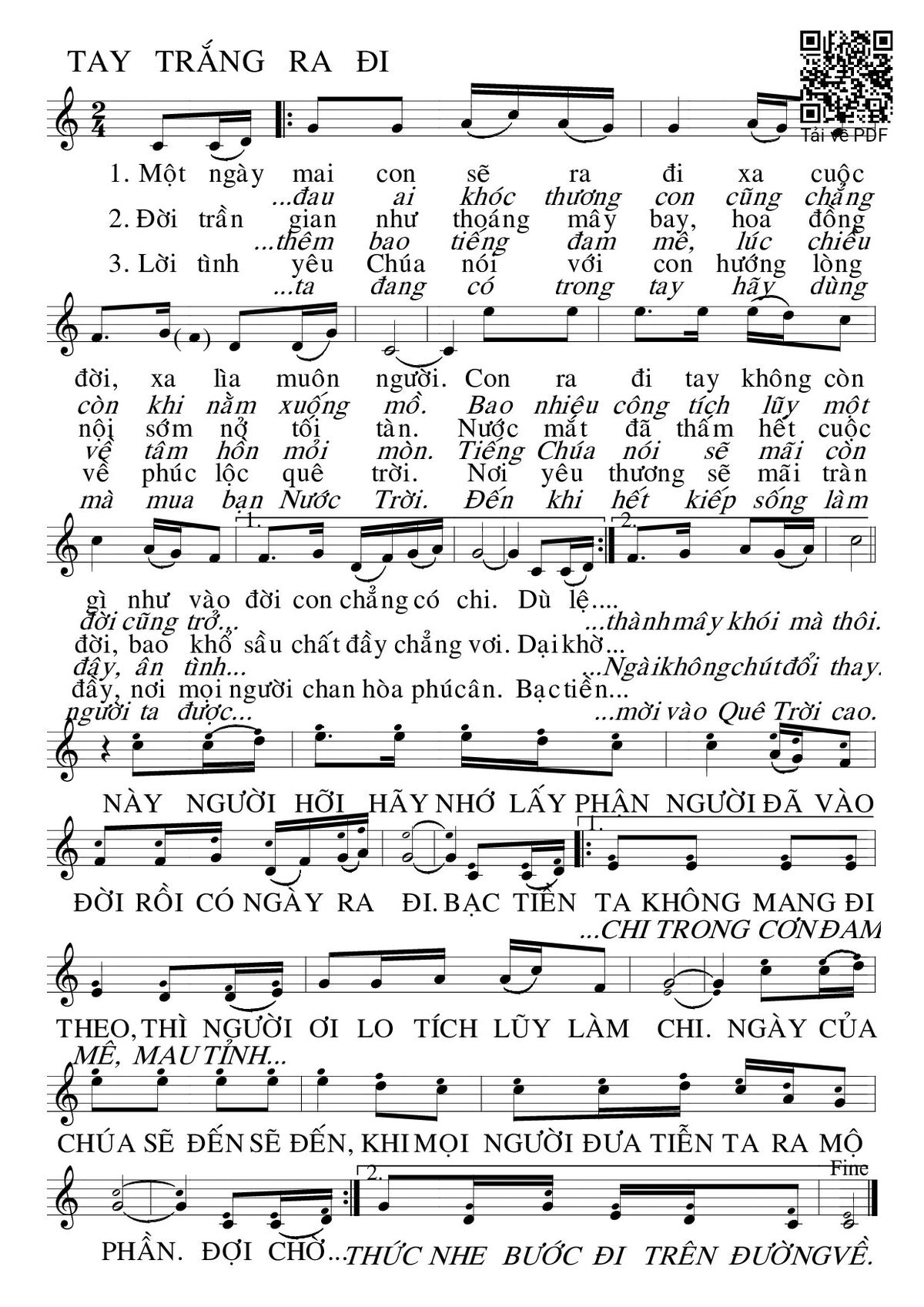 Sheet nhạc có nốt Tay trắng ra đi của nhạc sĩ Huy Hoàng và file PDF nốt nhạc đăng lên đây nhằm giúp các bạn xướng âm cho đúng nốt và hát thêm hay, chỉ mang tính chất tham khảo, không có mục đích thương mại. Bản quyền thuộc về tác giả và tổ chức nắm bản quyền, Truongca.com không giữ bất kỳ bản quyền của nội dung nào cả. Các bạn có thể tải về bản PDF chất lượng cao, gồm khuông nhạc có nốt với đường link file PDF bên trên.