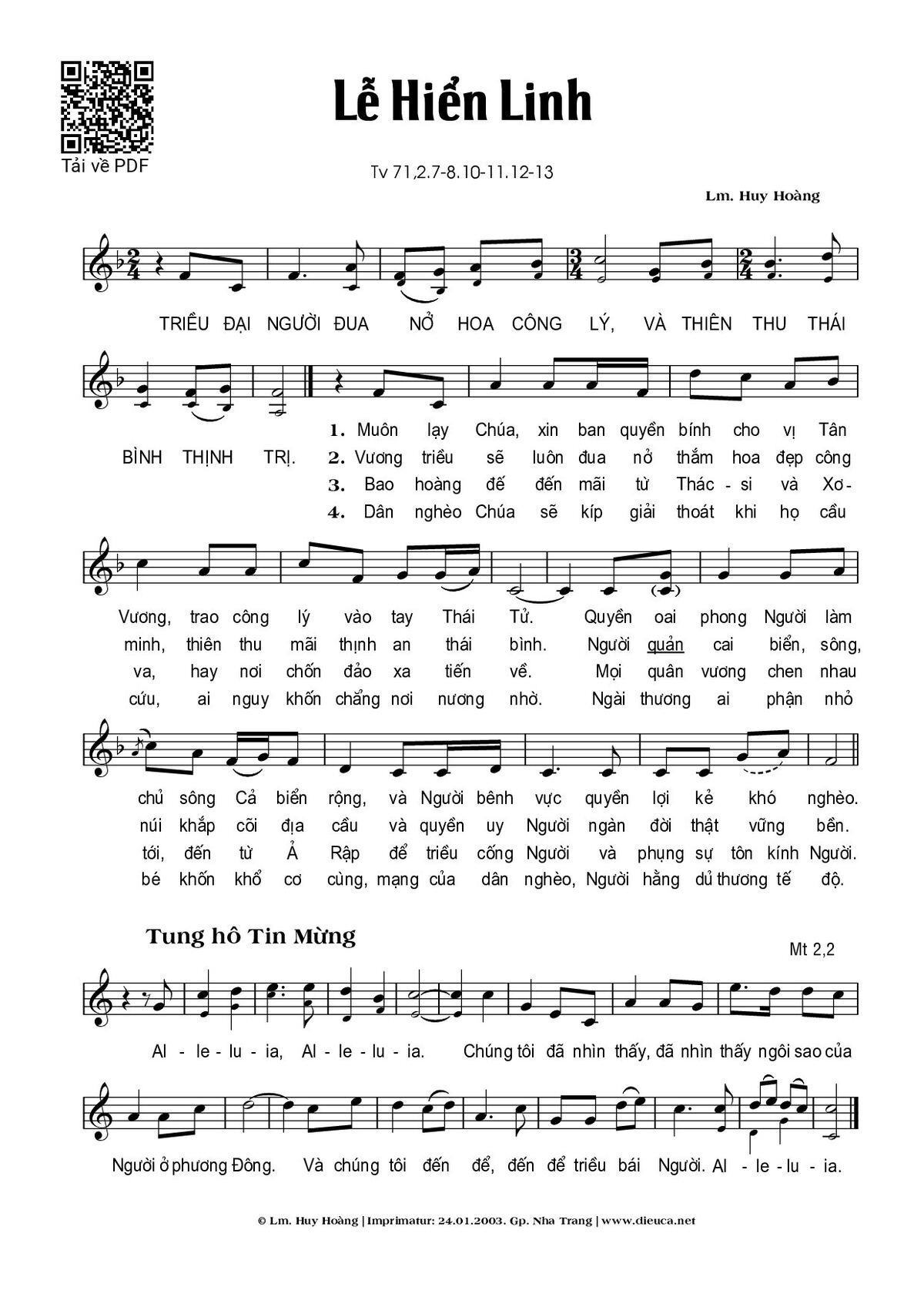 Sheet nhạc có nốt Lễ Hiển Linh (Thánh Vịnh 71) của nhạc sĩ Huy Hoàng và file PDF nốt nhạc đăng lên đây nhằm giúp các bạn xướng âm cho đúng nốt và hát thêm hay, chỉ mang tính chất tham khảo, không có mục đích thương mại. Bản quyền thuộc về tác giả và tổ chức nắm bản quyền, Truongca.com không giữ bất kỳ bản quyền của nội dung nào cả. Các bạn có thể tải về bản PDF chất lượng cao, gồm khuông nhạc có nốt với đường link file PDF bên trên.
