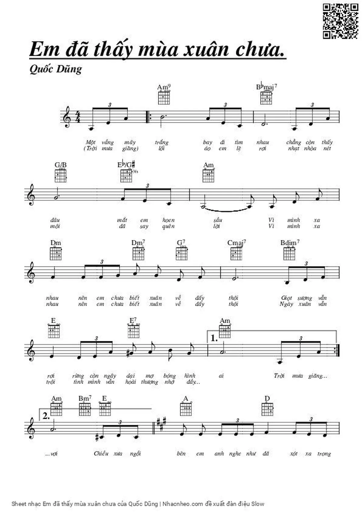 Chọn nút dấu + để tăng tông lên nửa cung, nút dấu - để giảm tông xuống nửa cung. Rê chuột vào hợp âm để xem các thế bấm hợp âm của bài hát Em đã thấy mùa xuân chưa.