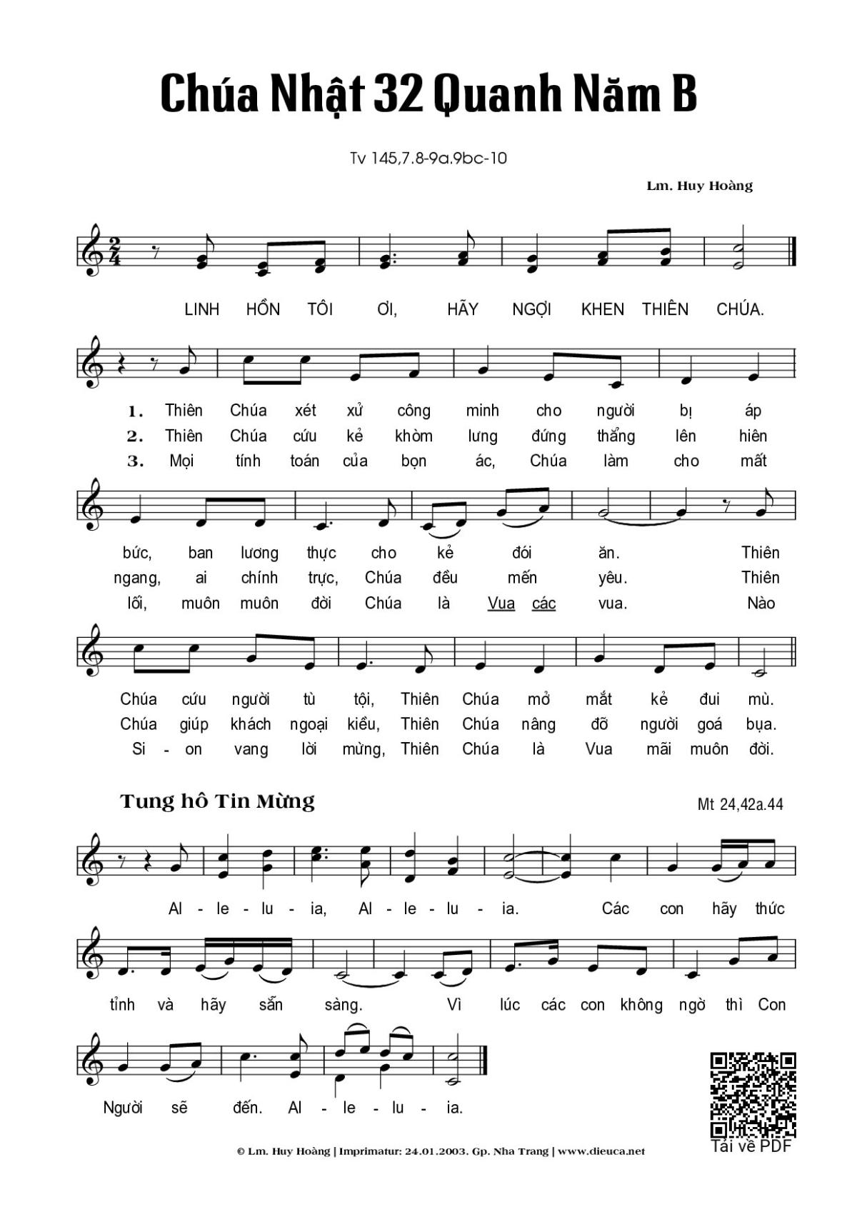 Sheet nhạc có nốt Chúa Nhật 32B Thường Niên (Thánh Vịnh 145) của nhạc sĩ Huy Hoàng và file PDF nốt nhạc đăng lên đây nhằm giúp các bạn xướng âm cho đúng nốt và hát thêm hay, chỉ mang tính chất tham khảo, không có mục đích thương mại. Bản quyền thuộc về tác giả và tổ chức nắm bản quyền, Truongca.com không giữ bất kỳ bản quyền của nội dung nào cả. Các bạn có thể tải về bản PDF chất lượng cao, gồm khuông nhạc có nốt với đường link file PDF bên trên.