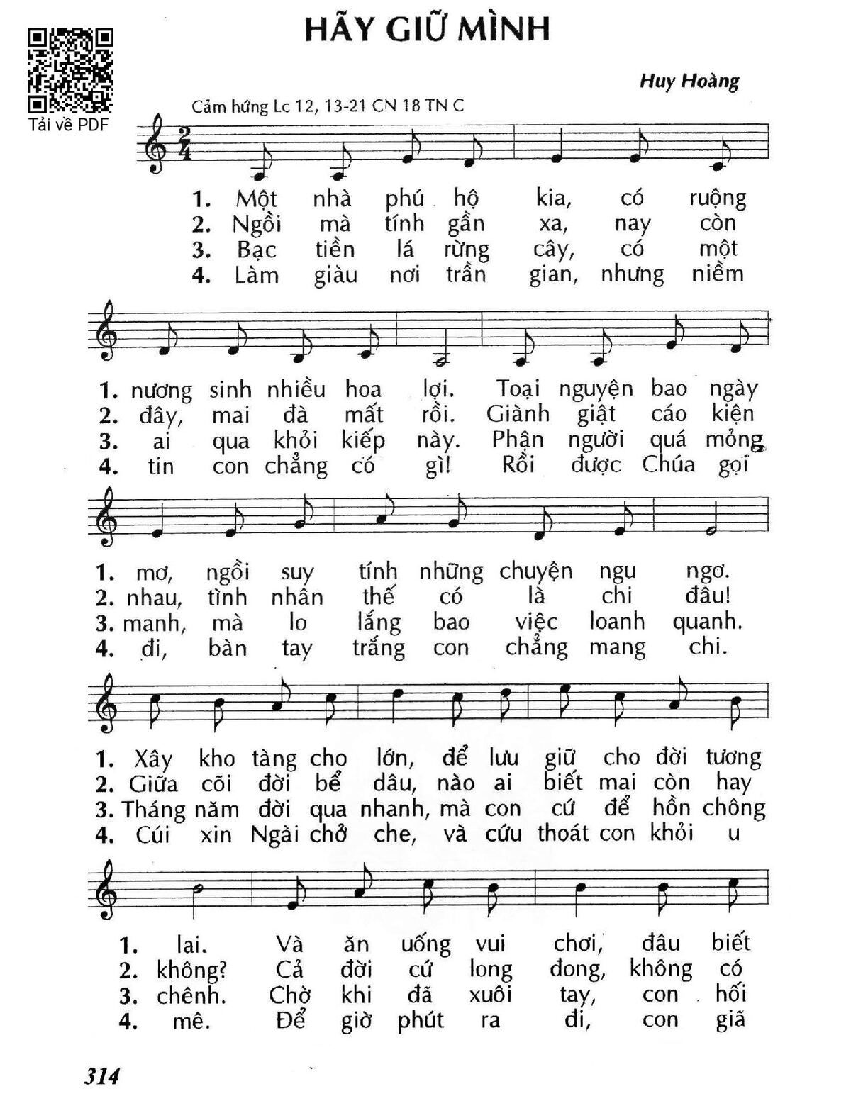 Sheet nhạc có nốt Hãy giữ mình (Lc. 12) của nhạc sĩ Huy Hoàng và file PDF nốt nhạc đăng lên đây nhằm giúp các bạn xướng âm cho đúng nốt và hát thêm hay, chỉ mang tính chất tham khảo, không có mục đích thương mại. Bản quyền thuộc về tác giả và tổ chức nắm bản quyền, Truongca.com không giữ bất kỳ bản quyền của nội dung nào cả. Các bạn có thể tải về bản PDF chất lượng cao, gồm khuông nhạc có nốt với đường link file PDF bên trên.