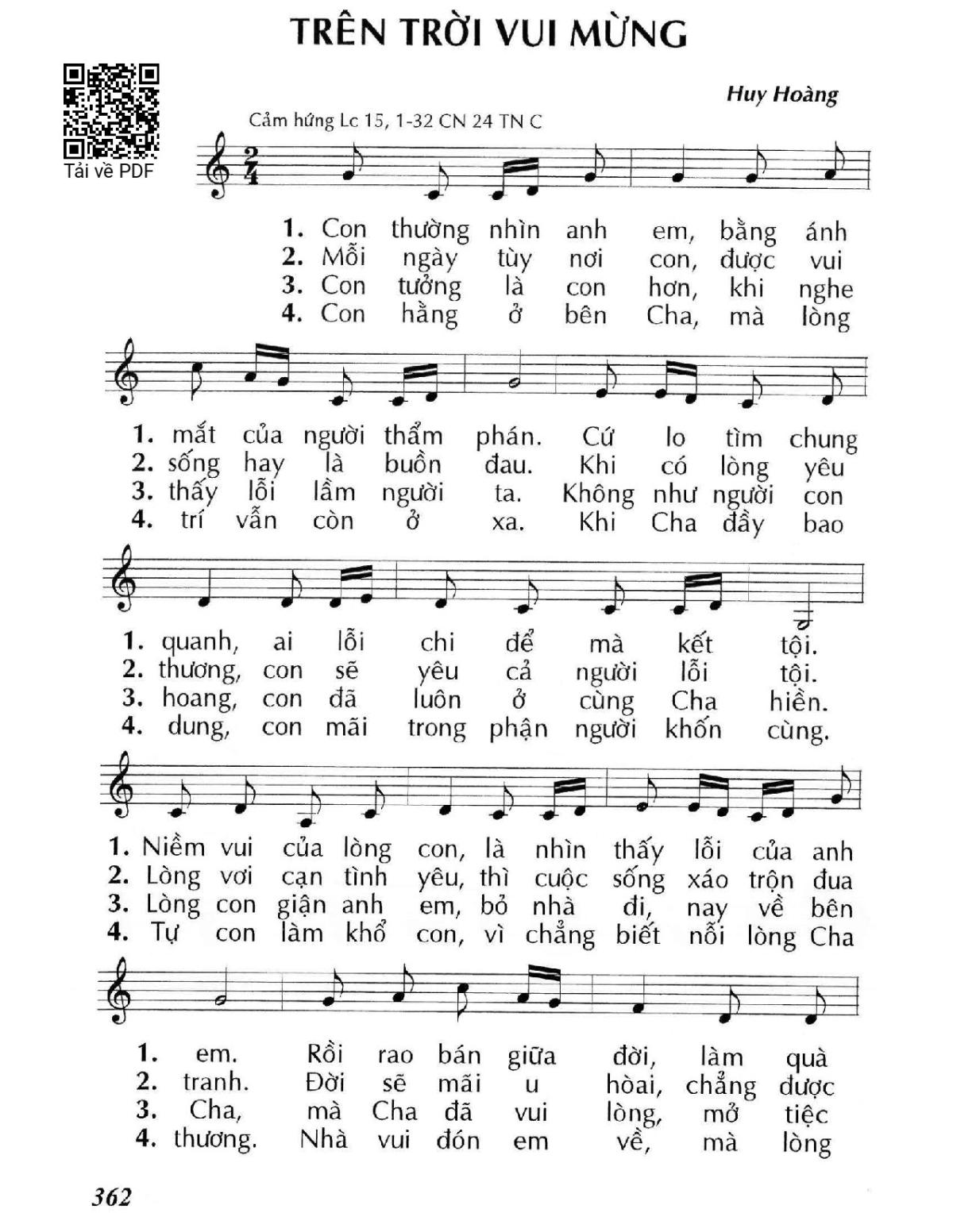 Sheet nhạc có nốt Trên trời vui mừng (Lc. 15) của nhạc sĩ Huy Hoàng và file PDF nốt nhạc đăng lên đây nhằm giúp các bạn xướng âm cho đúng nốt và hát thêm hay, chỉ mang tính chất tham khảo, không có mục đích thương mại. Bản quyền thuộc về tác giả và tổ chức nắm bản quyền, Truongca.com không giữ bất kỳ bản quyền của nội dung nào cả. Các bạn có thể tải về bản PDF chất lượng cao, gồm khuông nhạc có nốt với đường link file PDF bên trên.
