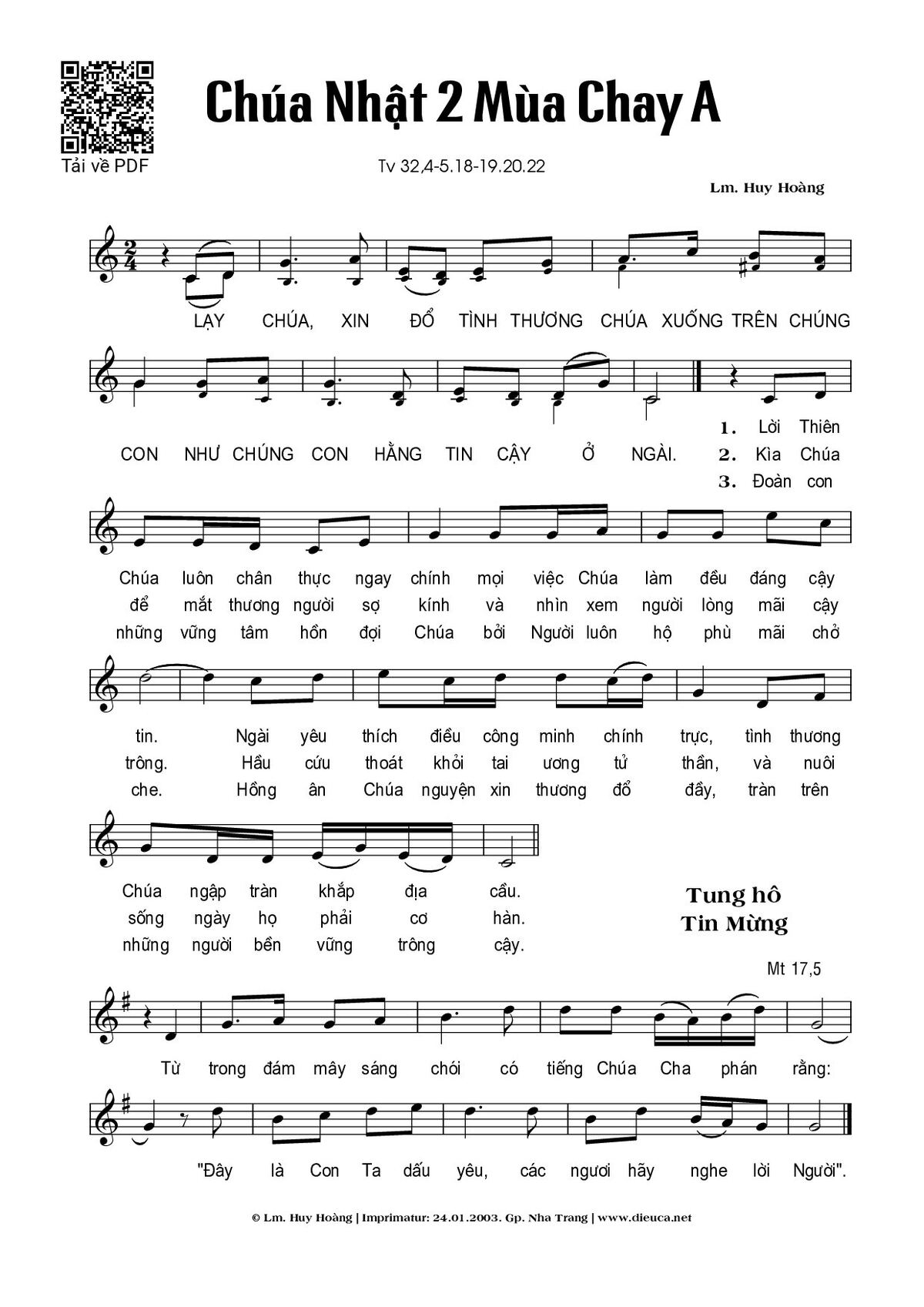 Sheet nhạc có nốt Chúa Nhật 2A Mùa Chay (Thánh Vịnh 32) của nhạc sĩ Huy Hoàng và file PDF nốt nhạc đăng lên đây nhằm giúp các bạn xướng âm cho đúng nốt và hát thêm hay, chỉ mang tính chất tham khảo, không có mục đích thương mại. Bản quyền thuộc về tác giả và tổ chức nắm bản quyền, Truongca.com không giữ bất kỳ bản quyền của nội dung nào cả. Các bạn có thể tải về bản PDF chất lượng cao, gồm khuông nhạc có nốt với đường link file PDF bên trên.