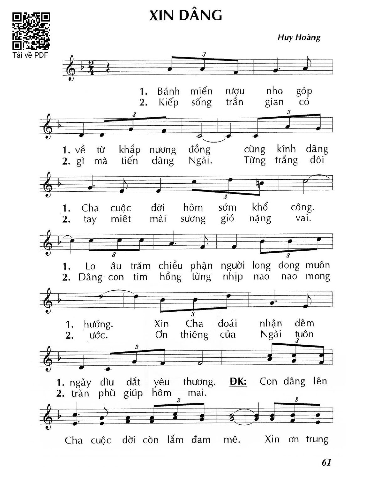 Sheet nhạc có nốt Xin dâng của nhạc sĩ Huy Hoàng và file PDF nốt nhạc đăng lên đây nhằm giúp các bạn xướng âm cho đúng nốt và hát thêm hay, chỉ mang tính chất tham khảo, không có mục đích thương mại. Bản quyền thuộc về tác giả và tổ chức nắm bản quyền, Truongca.com không giữ bất kỳ bản quyền của nội dung nào cả. Các bạn có thể tải về bản PDF chất lượng cao, gồm khuông nhạc có nốt với đường link file PDF bên trên.